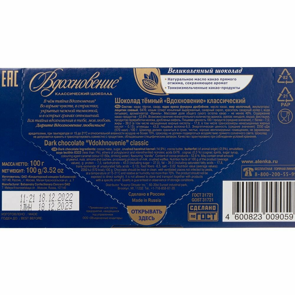 | Вид шоколада | темный |
