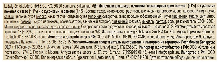 | Состав | сахар, какао масло, пальмовое масло, сухие сливки, сухое цельное молоко, какао тертое, сладкая сухая молочная сыворотка, карамель 1.1%: сахар, масло какао, пальмовое масло, сироп из глюкозы, сухое цельное молоко, масло сливочное, миндаль, лактоза, соль, натуральный ароматизатор, ароматизаторы, эмульгаторы (лецитин соевый, лецитин подсолнечный); какао порошок обезжиренный 1%, кокосовое масло, мука пшеничная, молочный жир, эмульгатор лецитин соевый, натуральный ароматизатор, натуральный ванильный ароматизатор, пшеничный крахмал, соль морская, разрыхлители (гидрокарбонат натрия, гидрокарбонат аммония); может содержать следы арахиса, орехов и яйцо |
