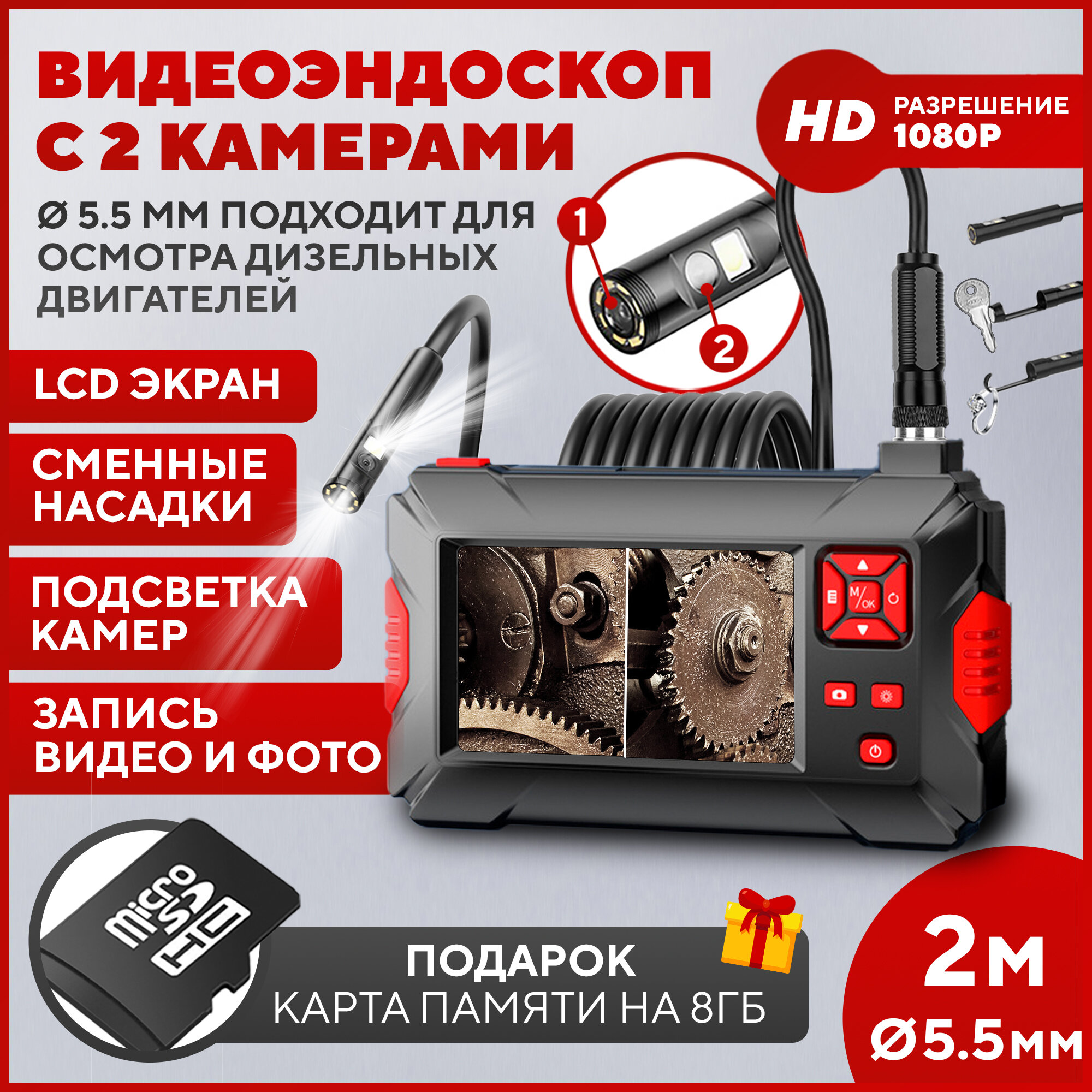 Купить Эндоскоп с экраном и 2 камерами, карта памяти на 8 гб в подарок, диаметр 5.5 мм, длина 2 м