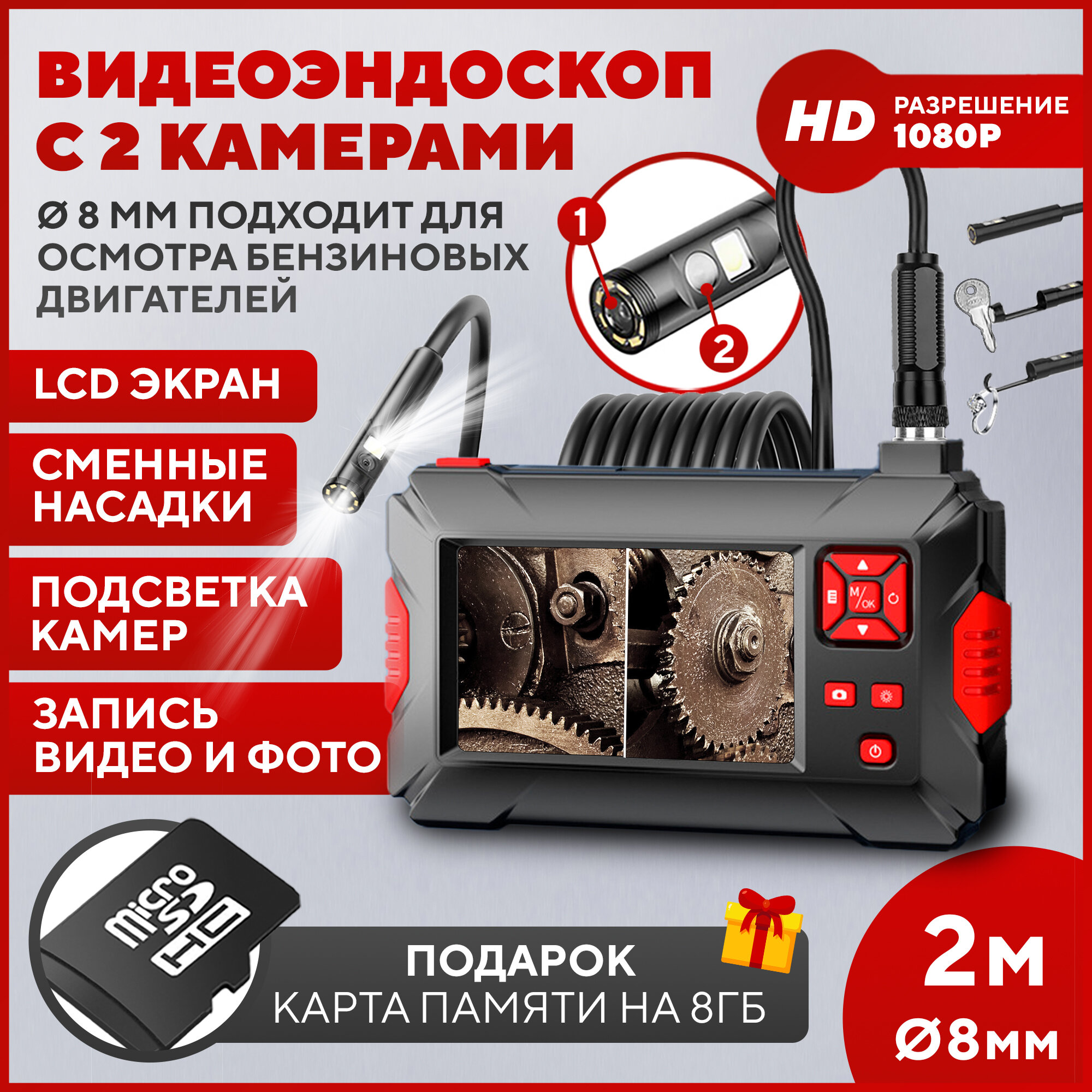 Купить Эндоскоп с экраном и 2 камерами, карта памяти на 8 гб в подарок, диаметр 8 мм, длина 2 м
