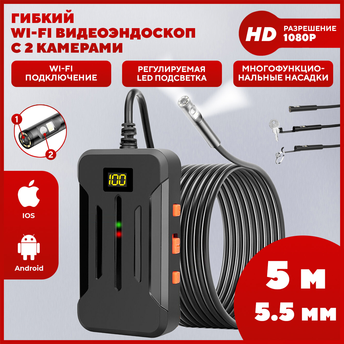 Купить Эндоскоп для смартфона автомобильный c 2 камерами, с подсветкой, гибкий, для iOS и Android, диаметр 5,5 мм, длина 5 м