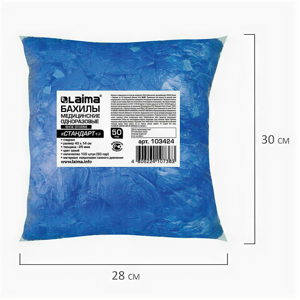 Бахилы комплект 100 штук (50 пар) в упаковке, СТАНДАРТ+, 40х14 см, 3 г, ПНД, LAIMA, 103424, 2 штуки интересное:
