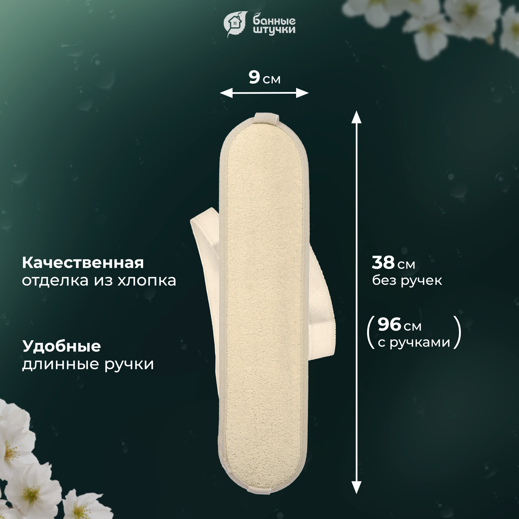 Купить Мочалка из люфы, лента с х/б ручками, овальная, 38х9 см (96х9 см с ручками), medium "Банные штучки" /для душа/массажная/тела/бани