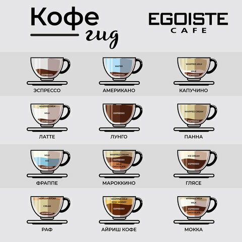 | Вид напитка | американо, гляссе, капучино, кортадо, кофе по-турецки, кофе с молоком, крема, латте, латте макиато, макиато, моккачино, ристретто, фильтр-кофе, черный кофе, чокочино, эспрессо, эспрессо-лунго |