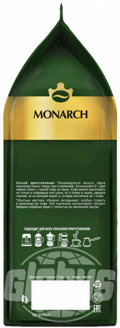 | Дополнительная информация | рекомендуется молоть зерна непосредственно перед приготовлением; используйте 6 г (две чайные ложки с горкой кофе на чашку); можно приготовить не только в кофеварке или турке, но и прямо в чашке, заварив горячей, но не кипящей водой и оставив настояться на 1-3 минуты; ВНИМАНИЕ: в ваших заказах может быть как Jacobs Monarch, так и Monarch |