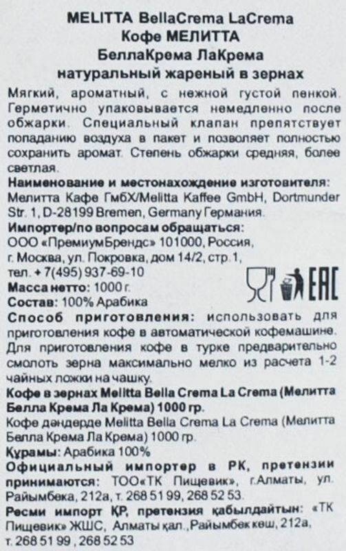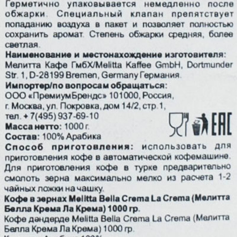 Melitta Кофе в зернах Melitta Bella Crema La Crema, 1 кг интересное: