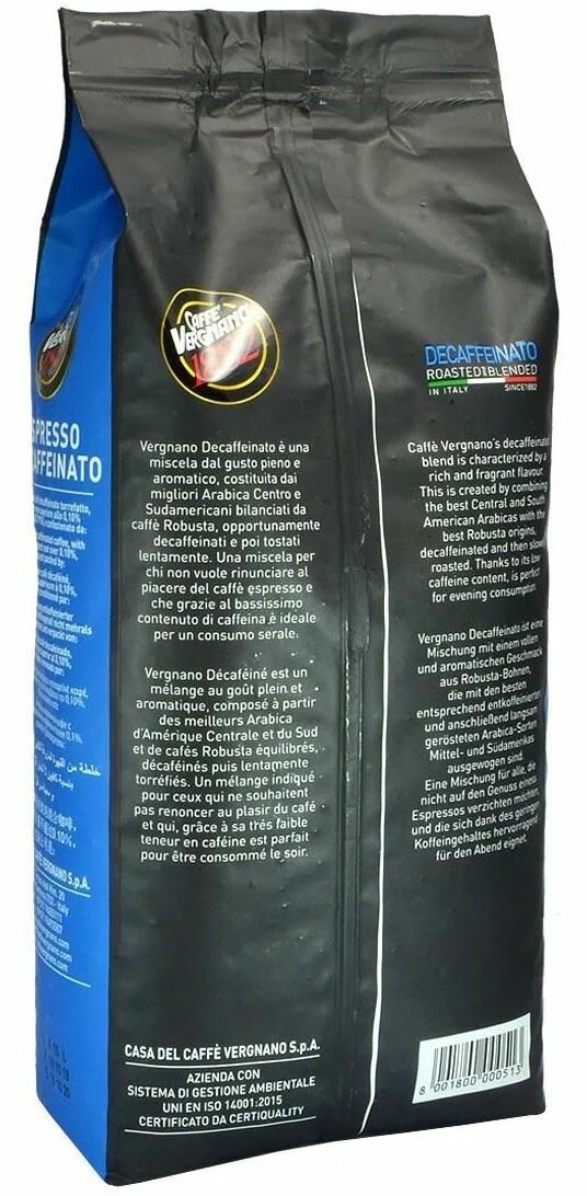 Купить Кофе в зернах Vergnano Decaffeinato, 1кг, мягкий, средняя обжарка / Вергнано Декаффеинато / Натуральный жареный зерновой кофе