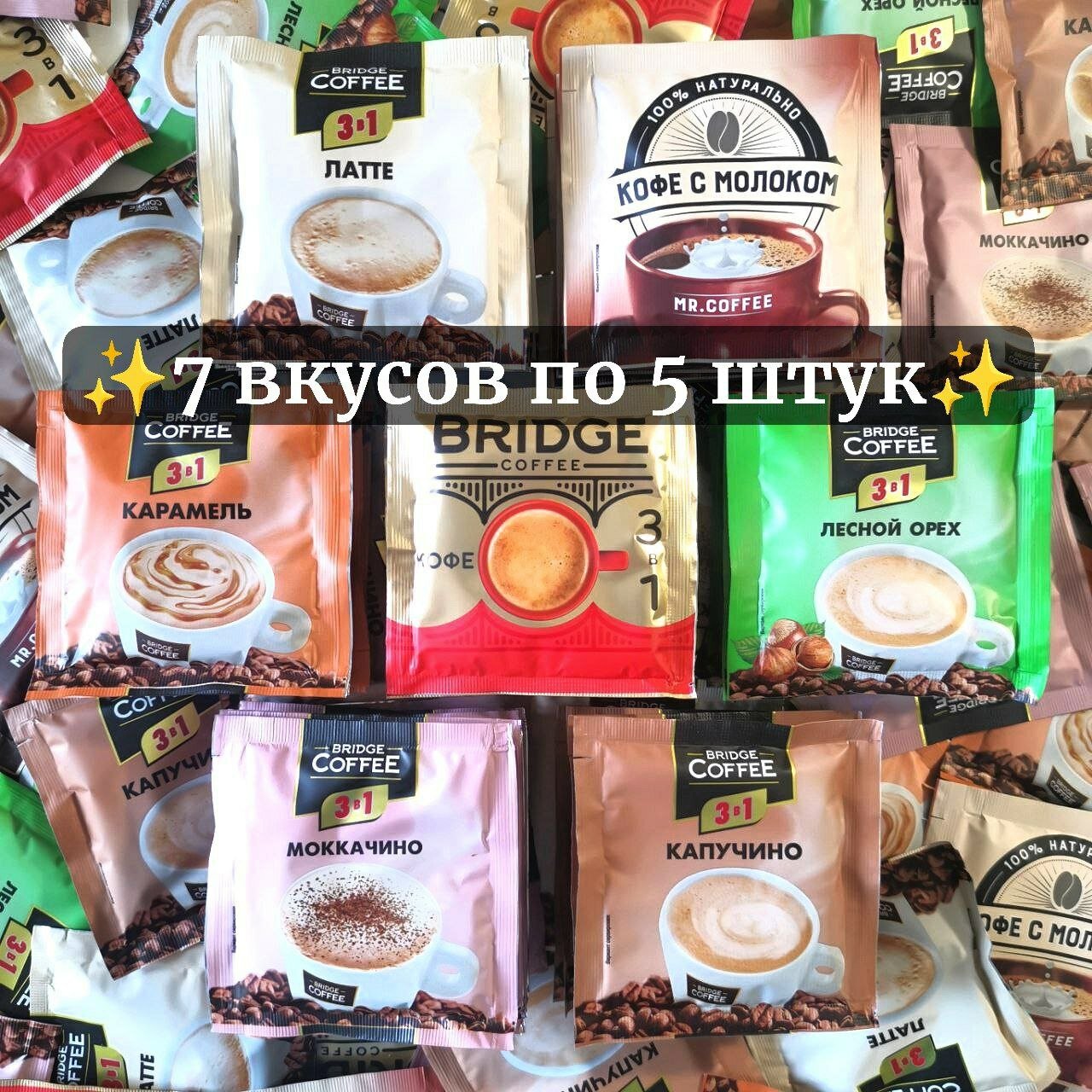 Купить Bridge Coffee Кофе 3 в 1 Ассорти вкусов 7 видов по 5 шт Кофе с молоком,Капучино,Латте,С ароматом лесного ореха,Карамель,Моккачино