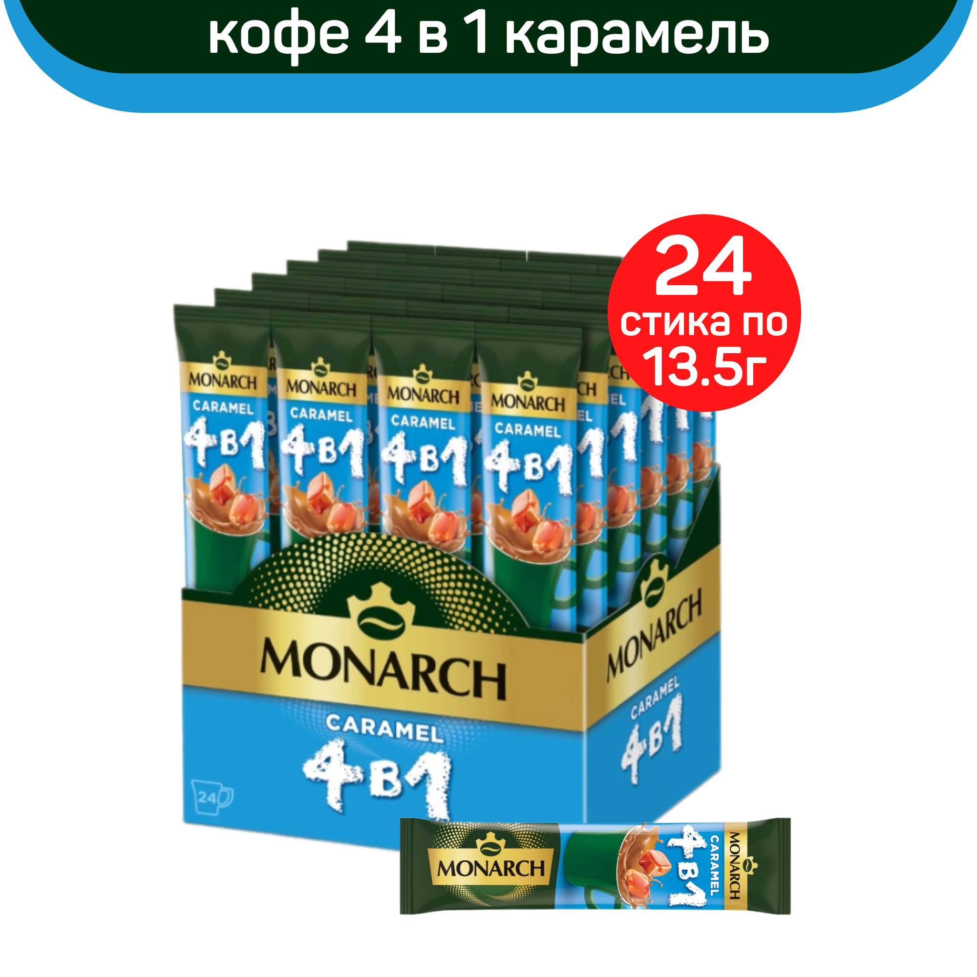 Напиток кофейный растворимый Monarch 4 в 1 Caramel, в стиках, 24 уп., 324 г интересное: