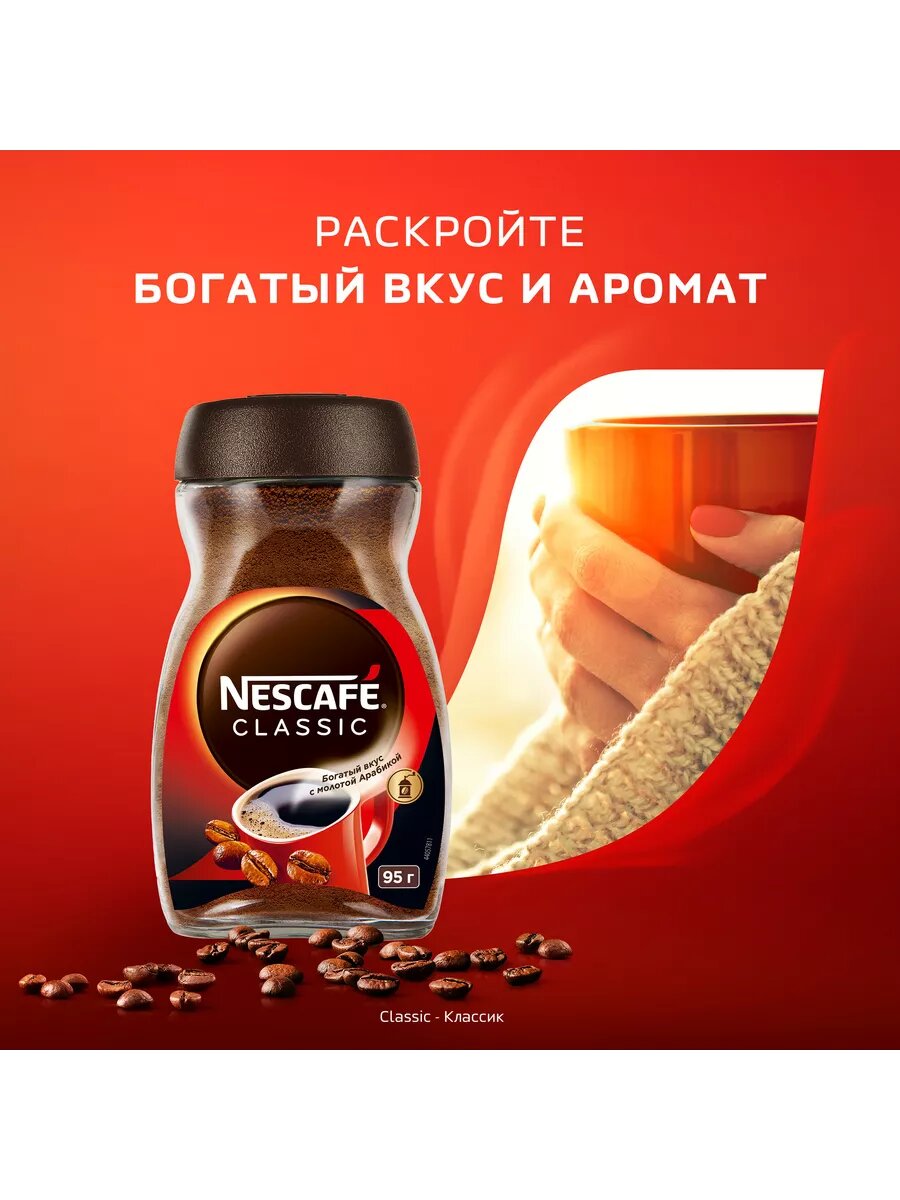 Кофе растворимый NESCAFE Classic 100% натуральный с добавлением натурального жареного молотого кофе банка 95г
