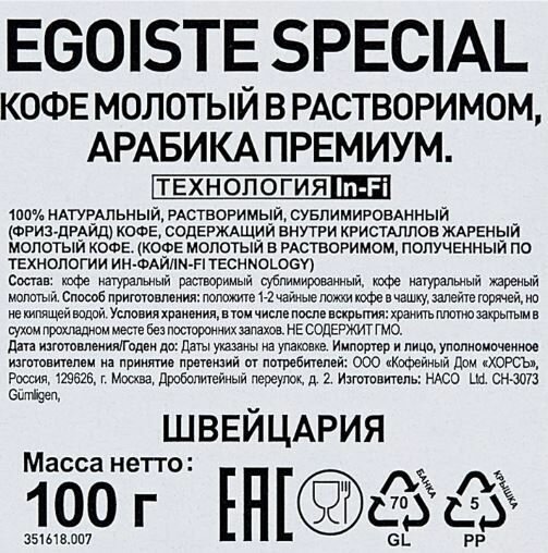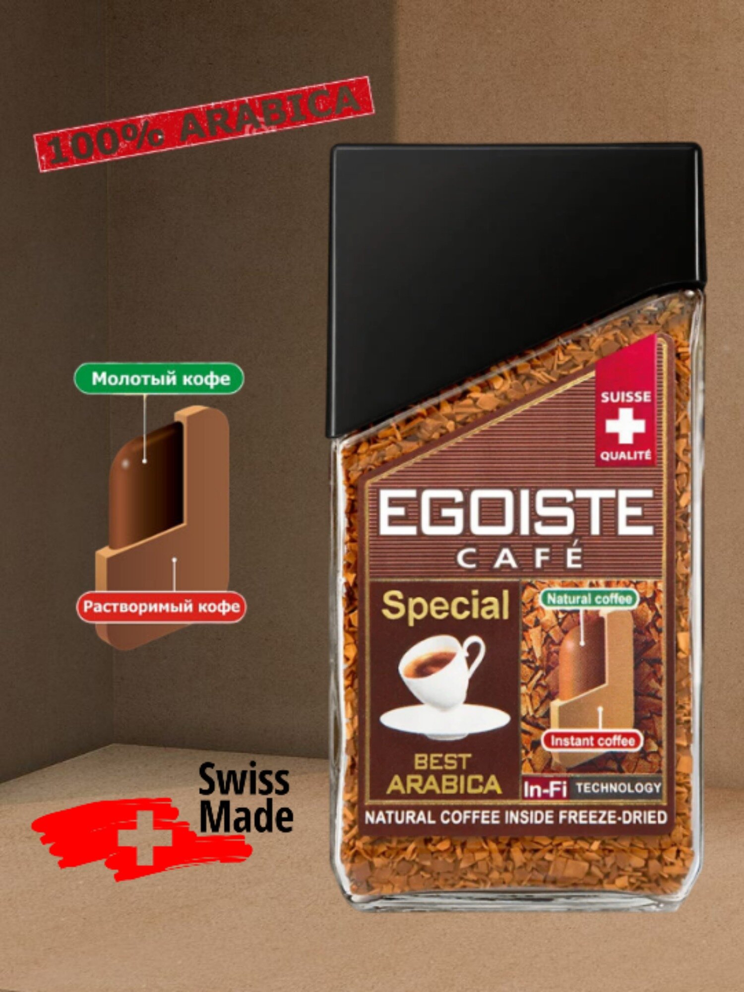СохранитьКофе Эгоист Спешл 100 гр (Egoiste Special) натуральный растворимый сублимированный с добавлением молотого стеклянная банка/Швейцария интересное: