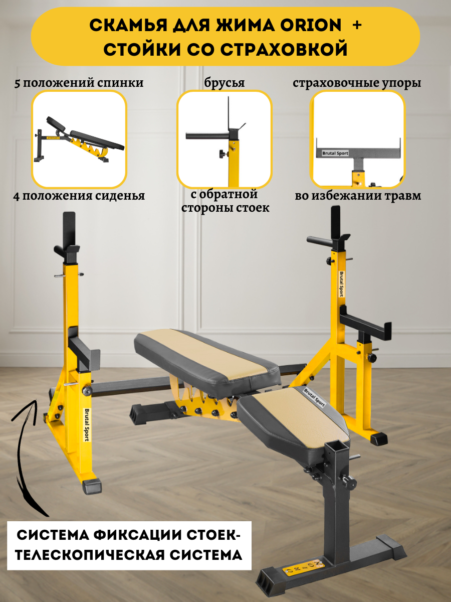 Купить Скамья для жима Orion Черно-Желтая + Стойки со страховкой Телескопические Желтые