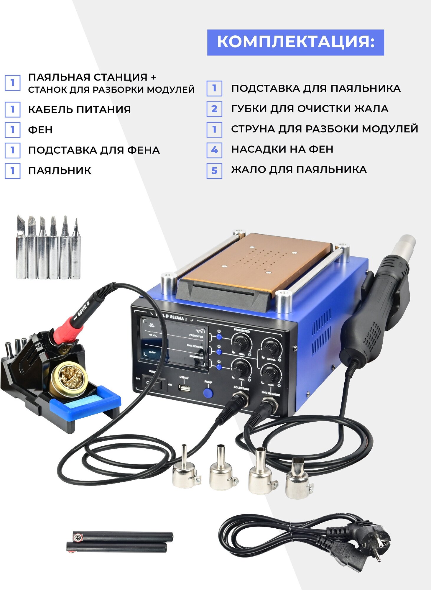 | Комплектация | Паяльная станция со станком для разборки сенсоров - 1 шт.; кабель питания - 1 шт.; паяльный фен - 1 шт.; подставка для фена - 1 шт.; паяльник - 1 шт.; подставка для паяльника - 1 шт.; губки для очистки жала - 2 шт.; струна для разборки модулей - 1 шт.; насадки на фен - 4 шт.; жало для паяльника - 5 шт. |