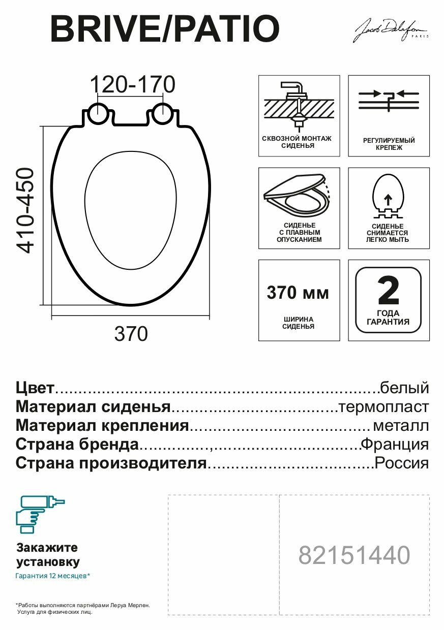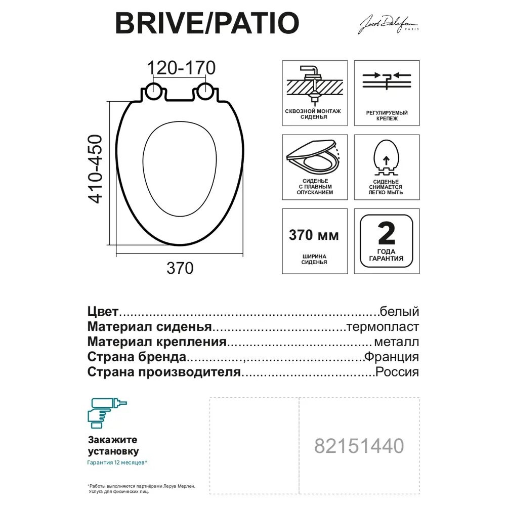 | Дополнительная информация | Сиденье для унитаза Jacob Delafon Brive/Patio из дюропласта с микролифтом |