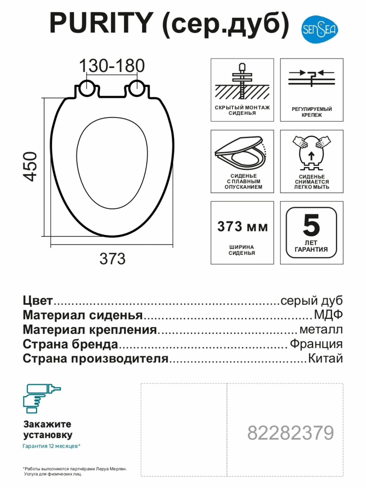 | Дополнительная информация | Сиденье для унитаза Sensea Purity овальное цвет серый дуб |