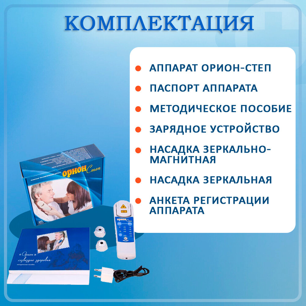 | Подробная комплектация | аппарат орион-степ; паспорт аппарата; методическое пособие; зарядное устройство; насадка зеркально-магнитная; насадка зеркальная; анкета регистрации аппарата |