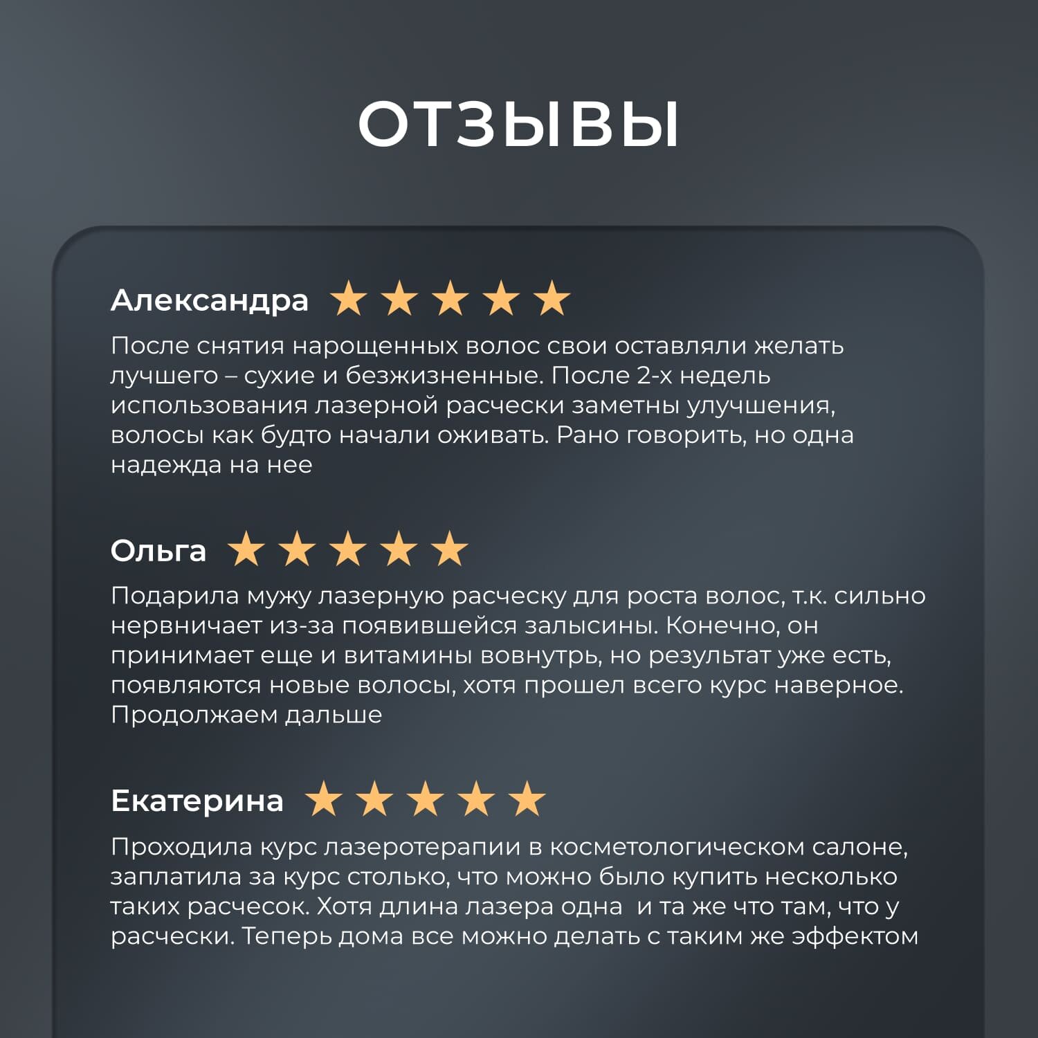 | Плюсы: | Лазерной расческой пользуюсь чуть меньше месяца, а результат уже заметен, волосы перестали выпадать , стали значительно живее, особенно после моего частого окрашивания волос и еще оказывает превосходный массаж головы. |