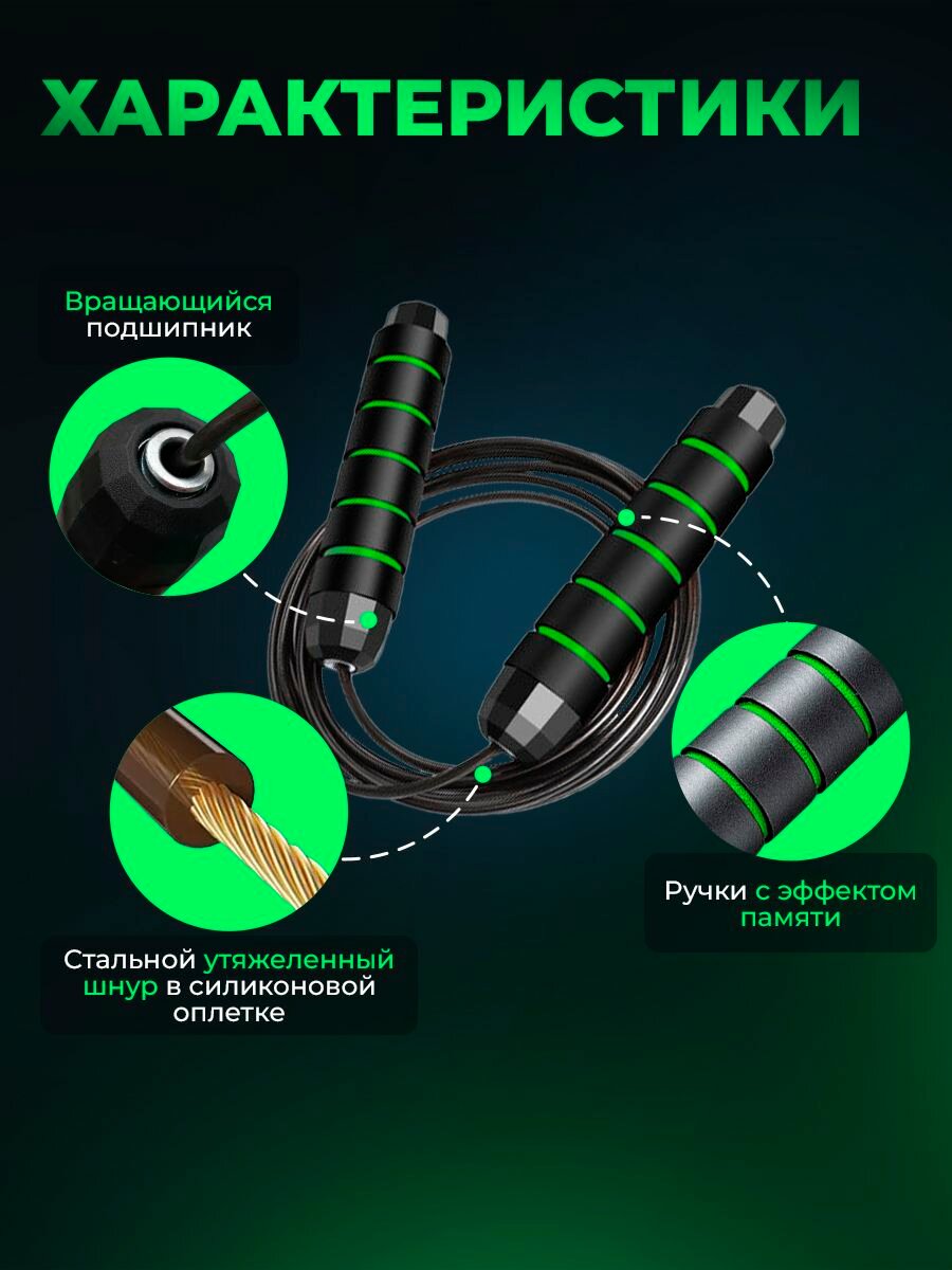 Скакалка спортивная для фитнеса зеленая, скакалка взрослая скоростная с металлическим шнуром и подшипником, 2,8 м интересное: