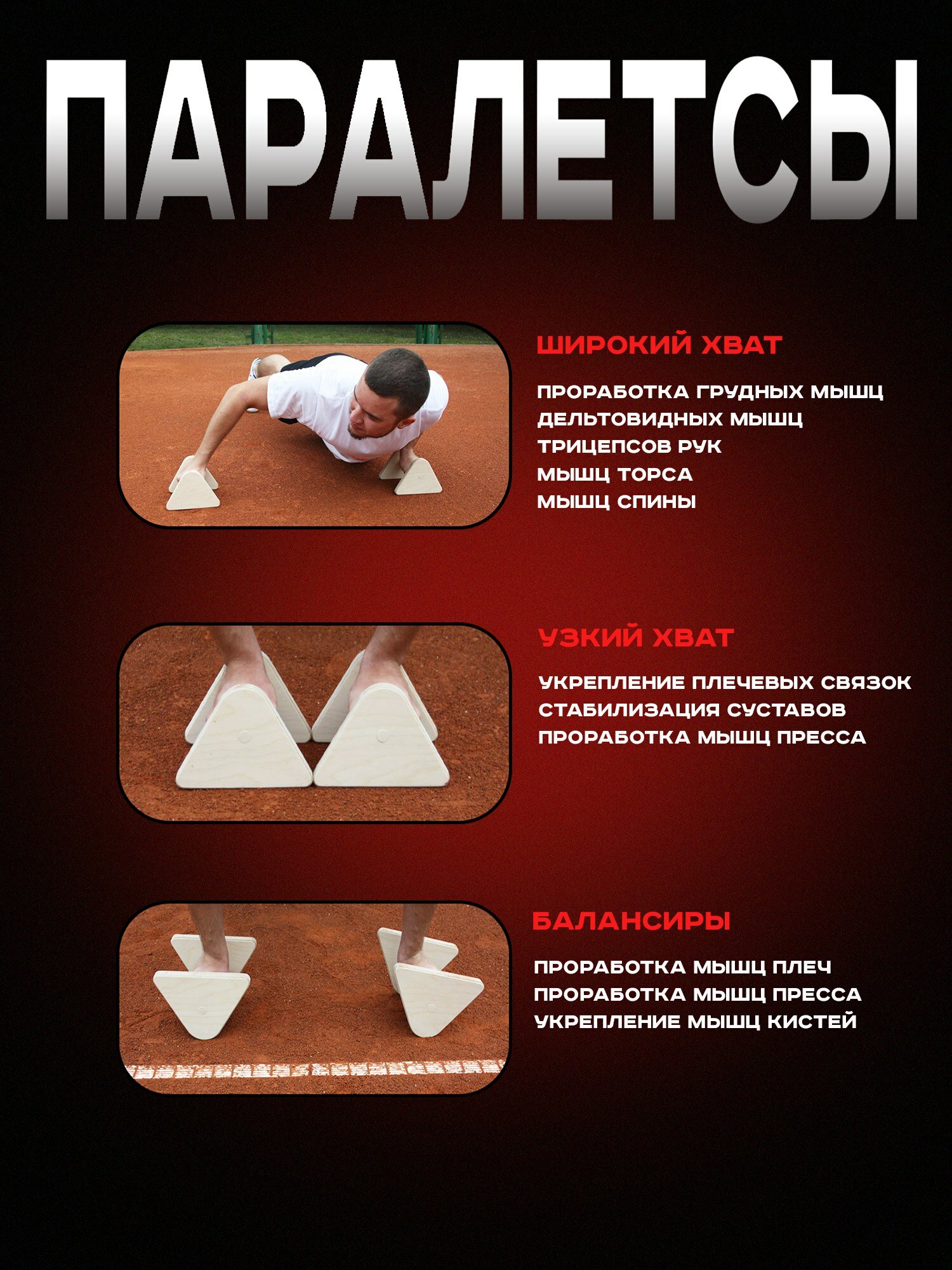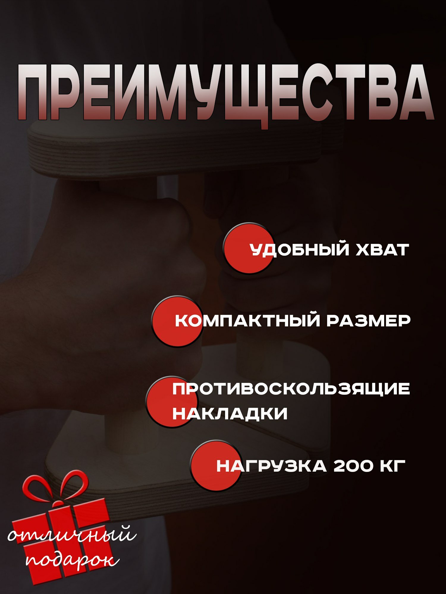 | Дополнительная информация | Паралетсы -это упоры для отжиманий, на которых тренируют уголок, стойку на руках, горизонт и другие упражнения с бóльшей амплитудой. Cтоялки гимнастические подойдут для отжиманий и тренировок с собственным весом тела. Низкие напольные брусья подходят для выполнения силовых и гимнастических упражнений, калистеники, воркаута и тренировок в домашних условиях. Такой деревянный тренажер будет отличным подарком на день рождения мужчине, парню, другу. Спортивный тренажер, доска, платформа, брусья, деревянные упоры для отжиманий для фитнеса дома и на улице. |