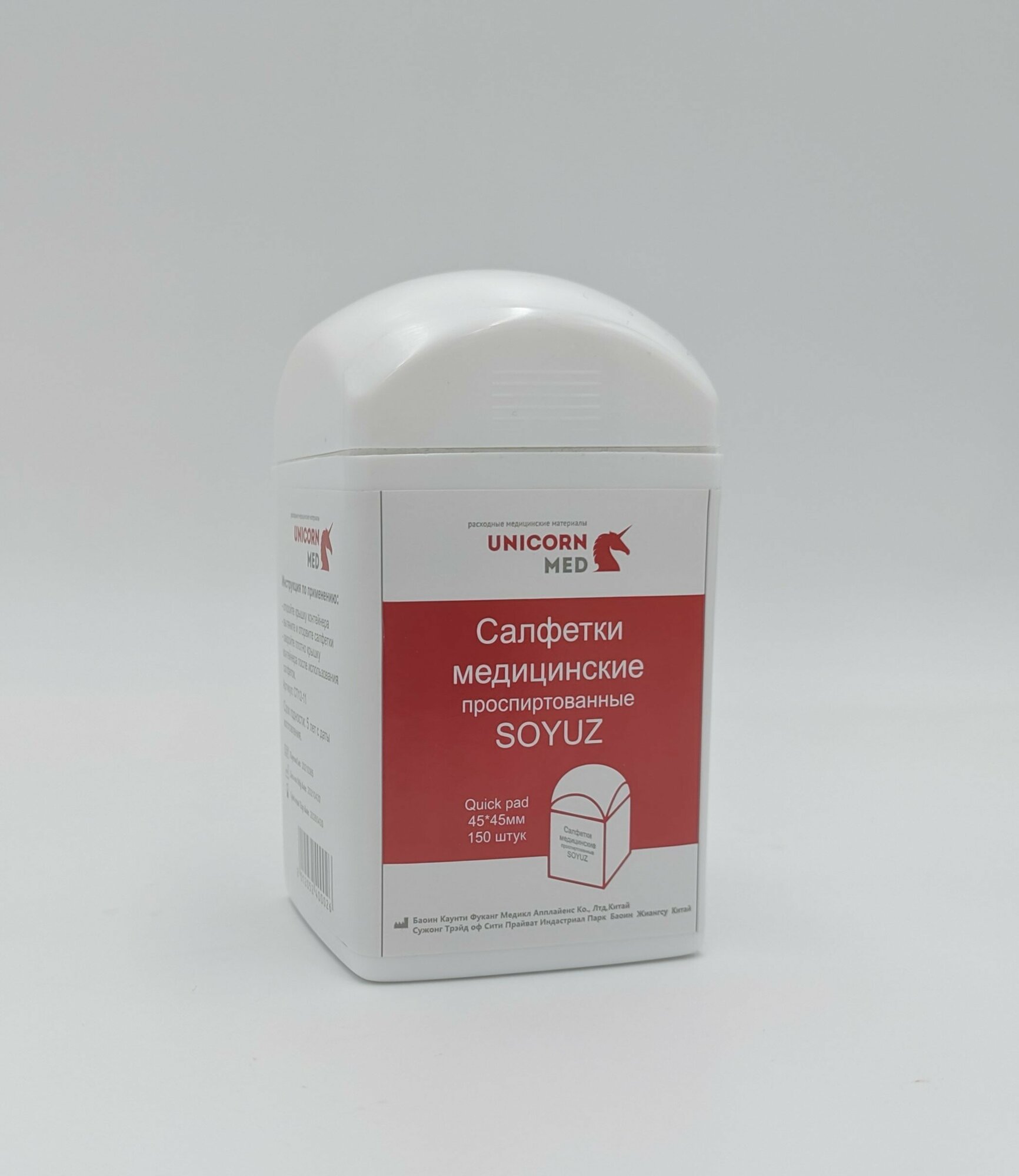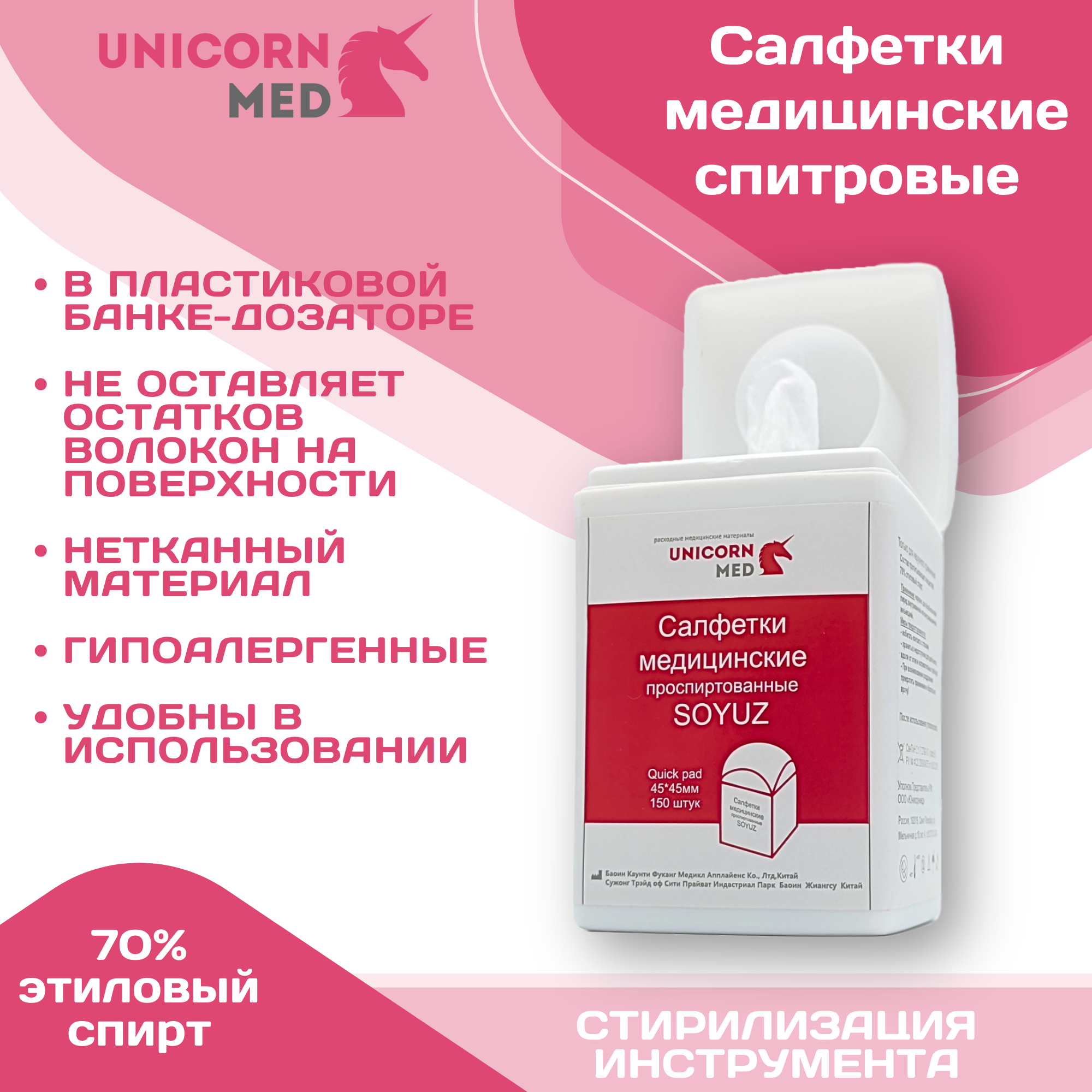 Купить Салфетки спиртовые медицинские 45x45 мм., 150 шт "SOYUZ" UnicornMed антисептические антибактериальные дезинфицирующие для инъекций в банке