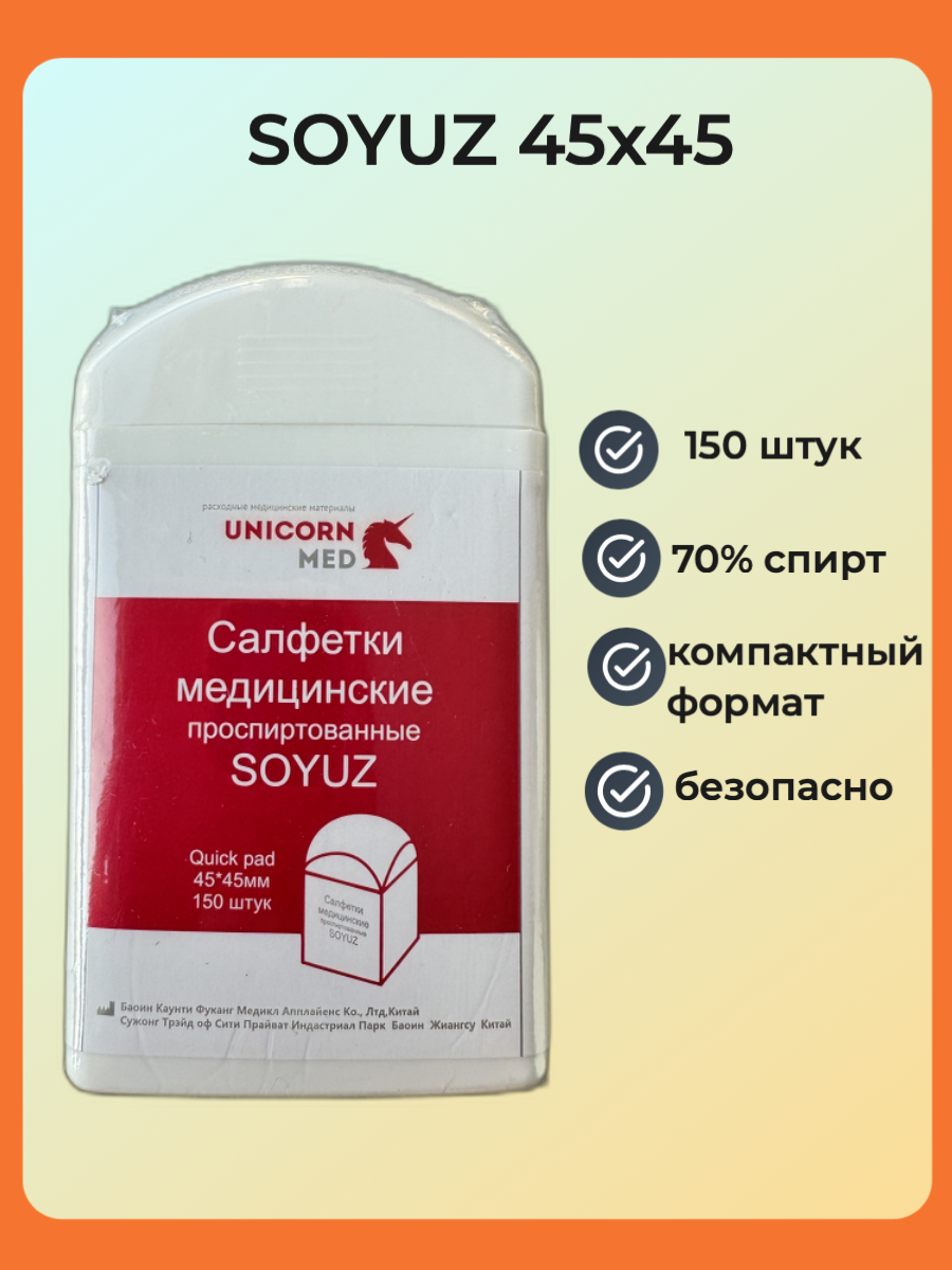 Спиртовые салфетки Unicorn Med SOYUZ, для инъекций, размер 110x125, 100 штук