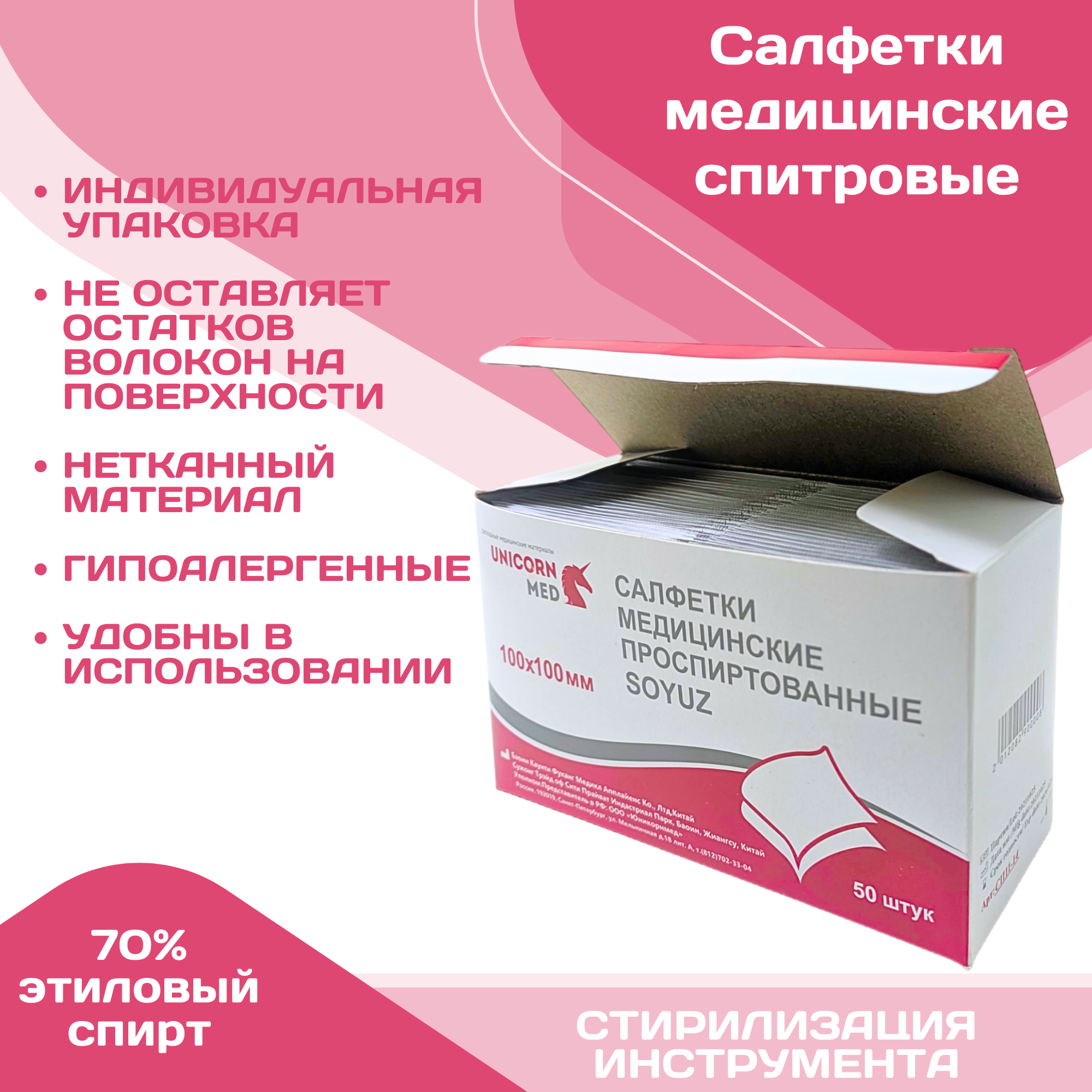 Спиртовые салфетки Unicorn Med SOYUZ, для инъекций, размер 110x125, 100 штук