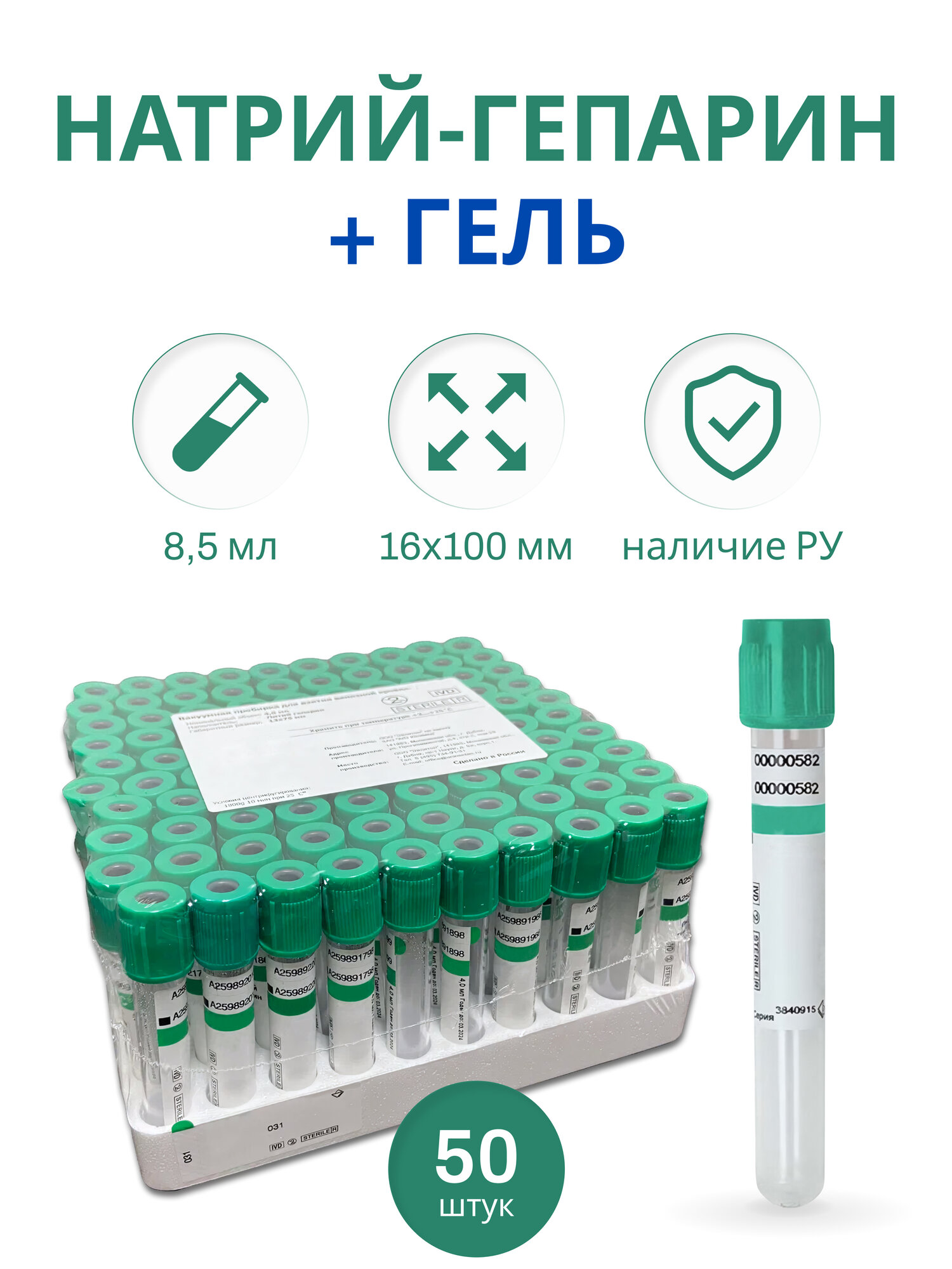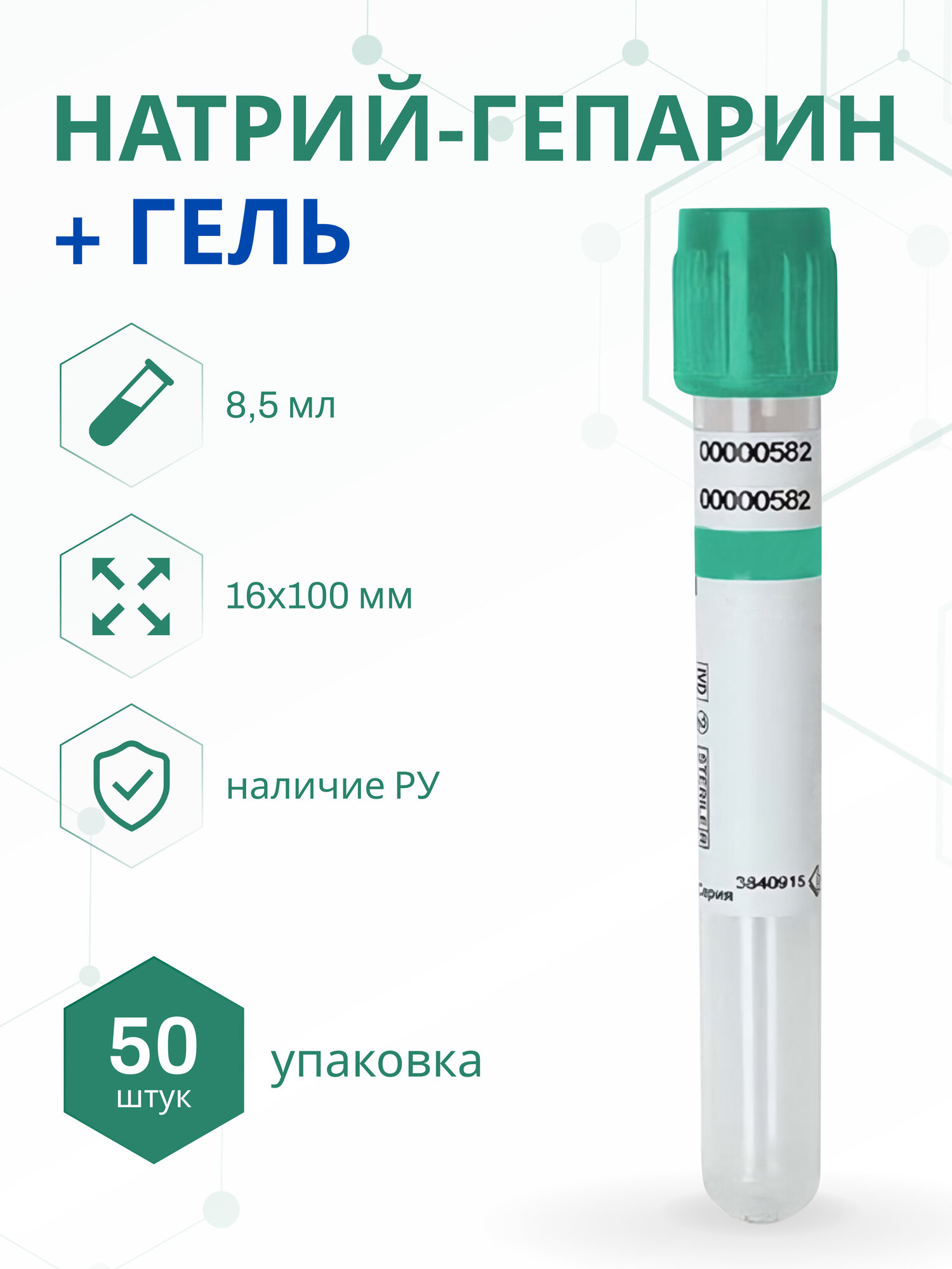 | Дополнительная информация | вакуумные пробирки с Na-гепарином и гелем 16х100 мм, 8.5 мл, 50 шт. |