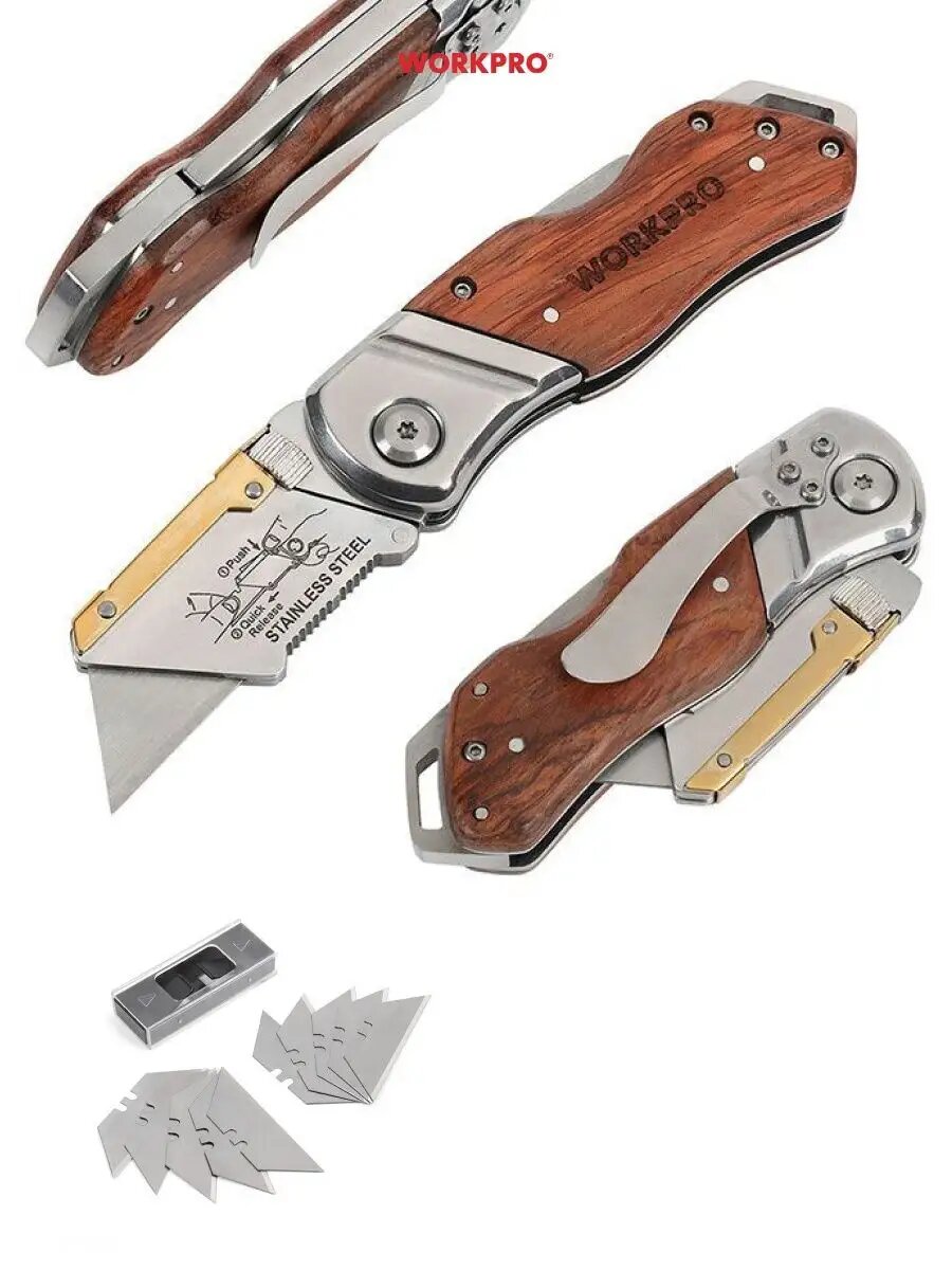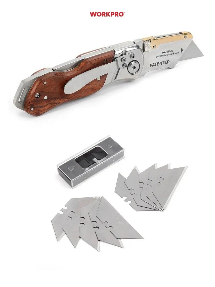 | Подробная комплектация | Складной нож WORKPRO ручка из дерева 10 лезвий |