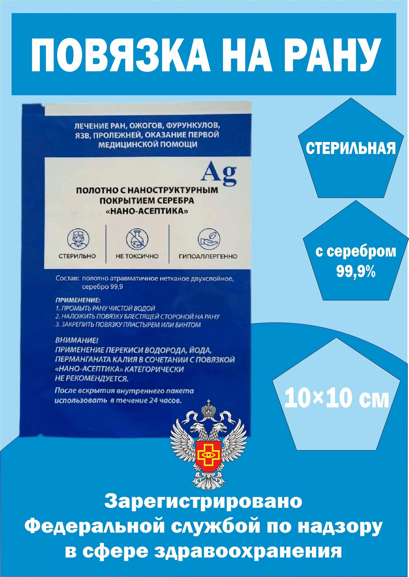 | Дополнительная информация | стерильная повязка на рану с серебром без содержания гидрогелей и мазей |