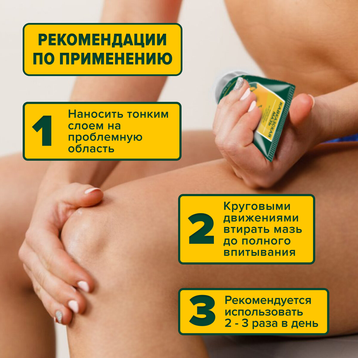 | Способ применения и дозы | Небольшое количество геля-бальзама втирать массажными движениями 2-3 раза в день до полного впитывания. |