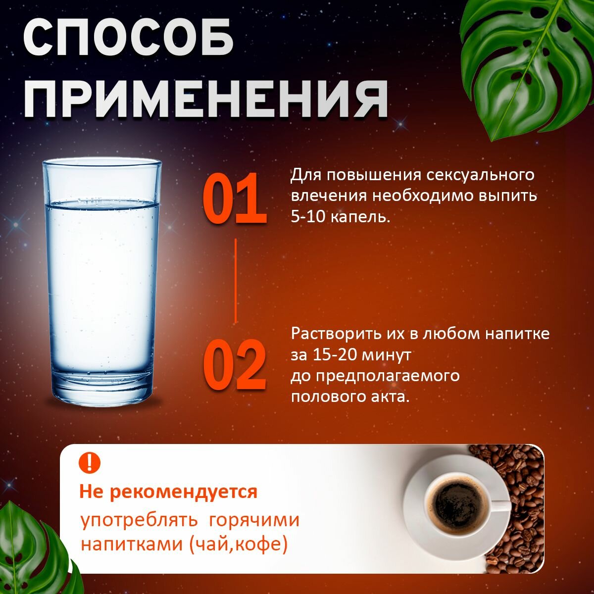 | Способ применения и дозы | 30 капель растворить в 100мл. воды или напитка, принимать за 30 минут до предполагаемого полового акта. Препарат может приниматься до 2 раз в течении 24 часов. Рекомендуемый курс беспрерывного применения до 7 дней, с повторными применениями курса через каждые 7 дней перерыва |