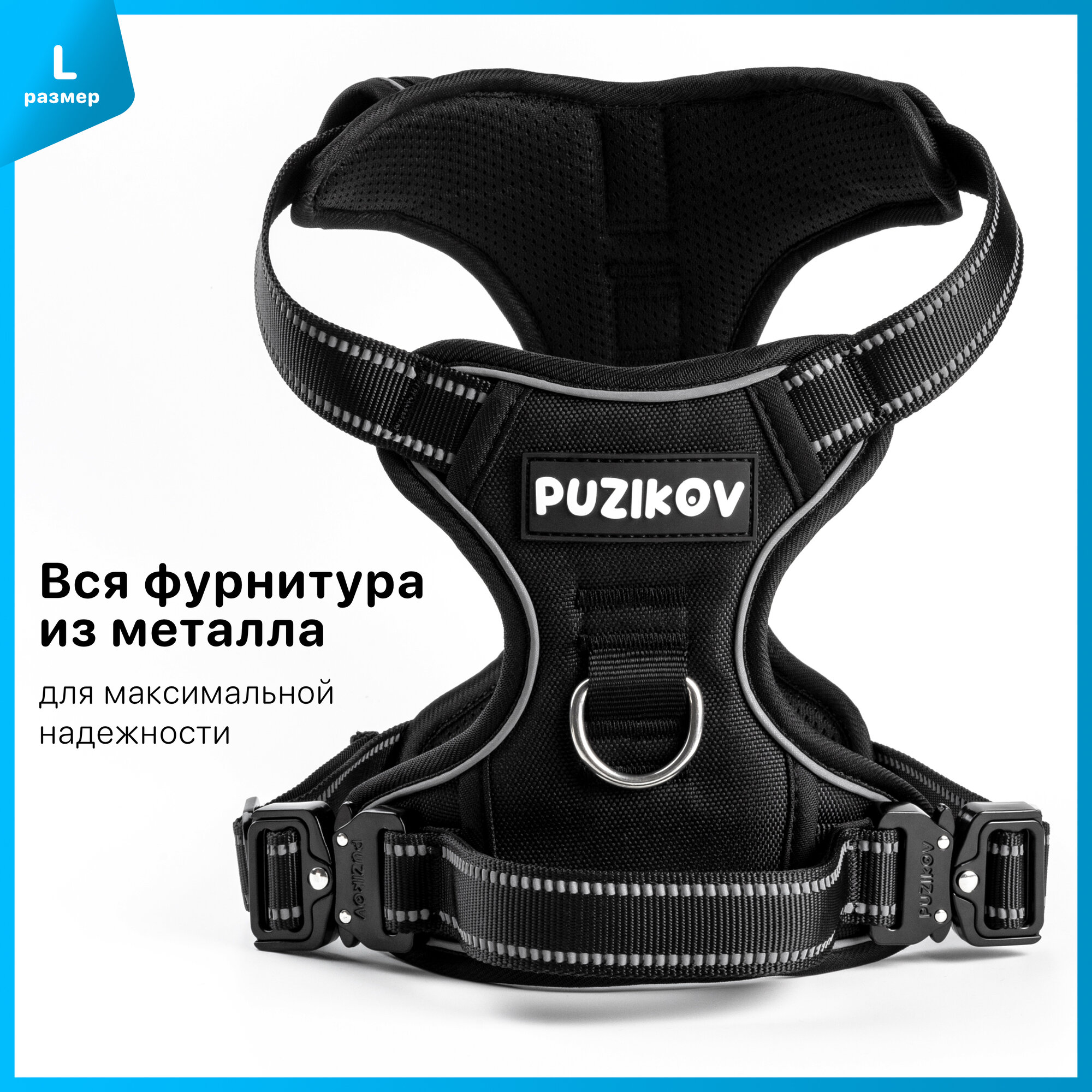 Шлейка для собак с фиксаторами из металла и мягкой ручкой, размер XL, черный, PUZIKOV / пузиков