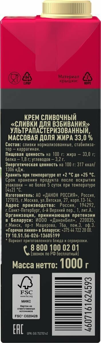 | Состав | Сливки нормализованные, стабилизатор - каррагинан. |