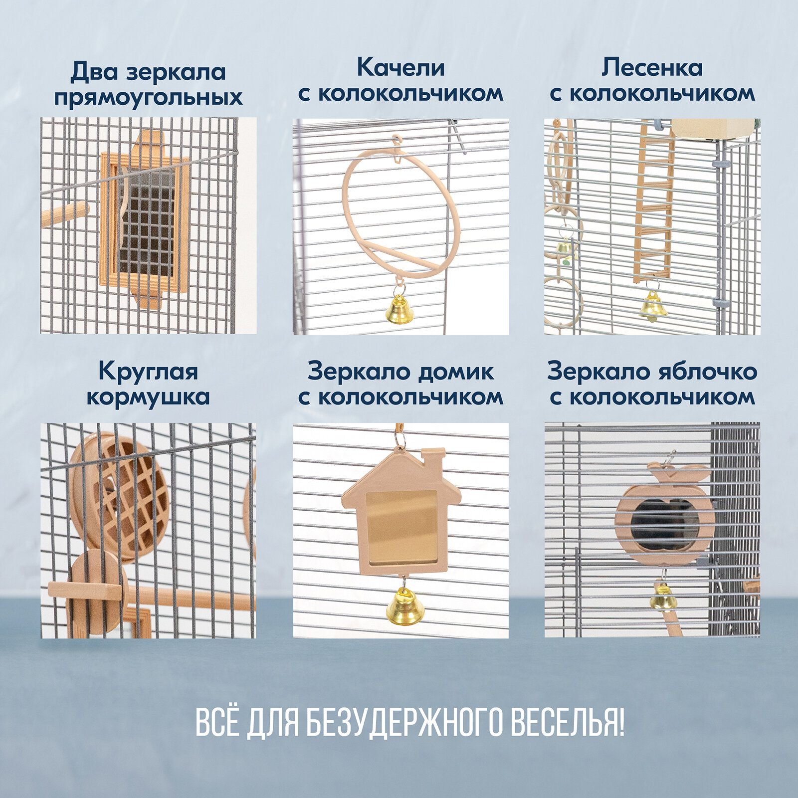 | В комплекте | жёрдочка / зеркальце / качели / кормушка / лесенка / поилка |