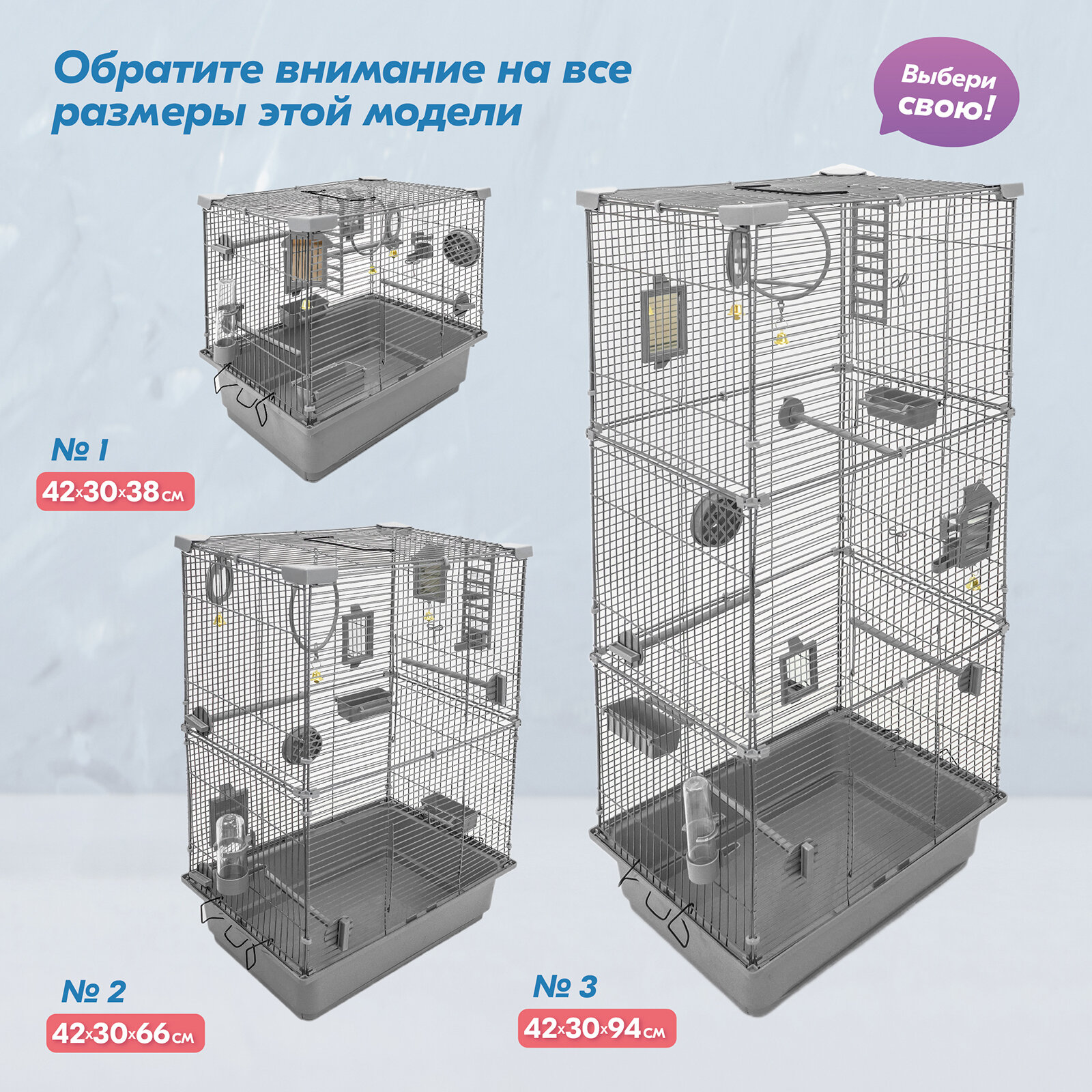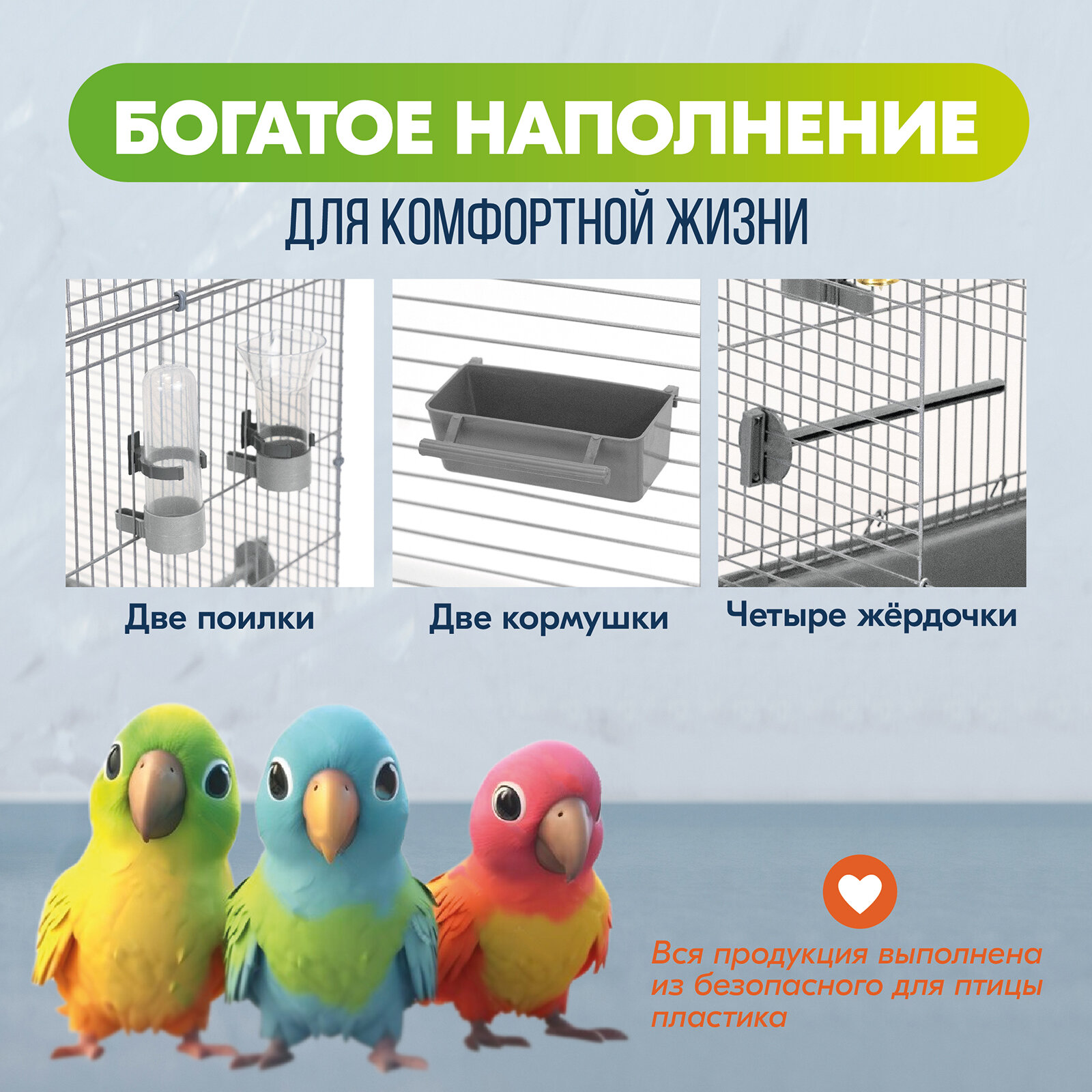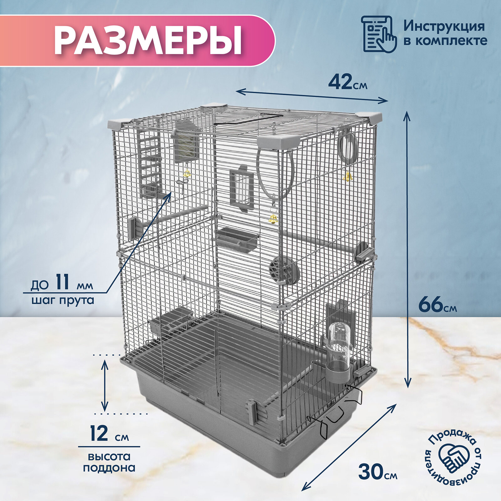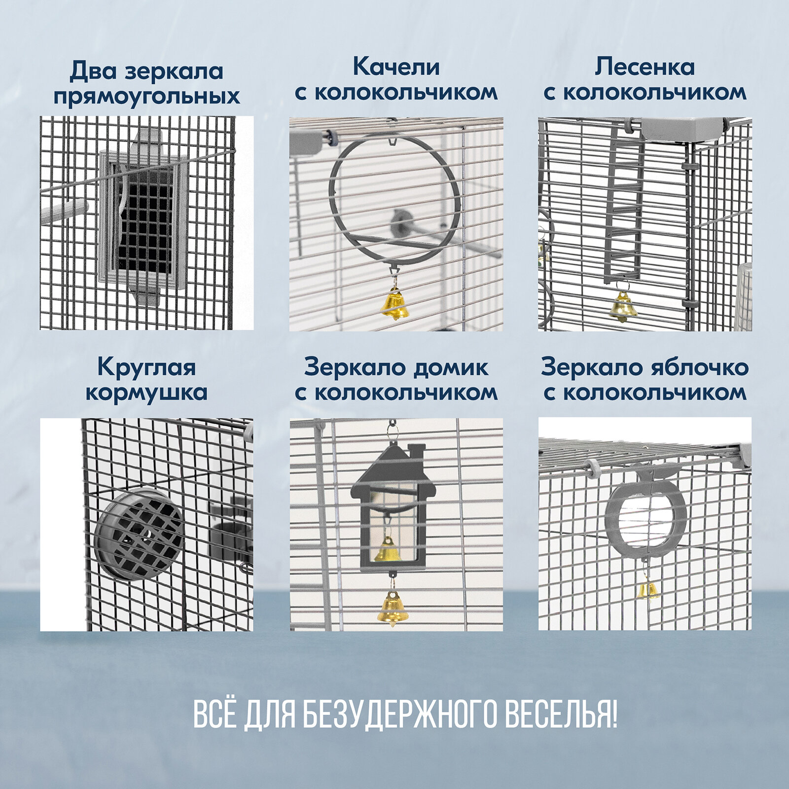 | В комплекте | жёрдочка / зеркальце / качели / кормушка / лесенка / поилка |