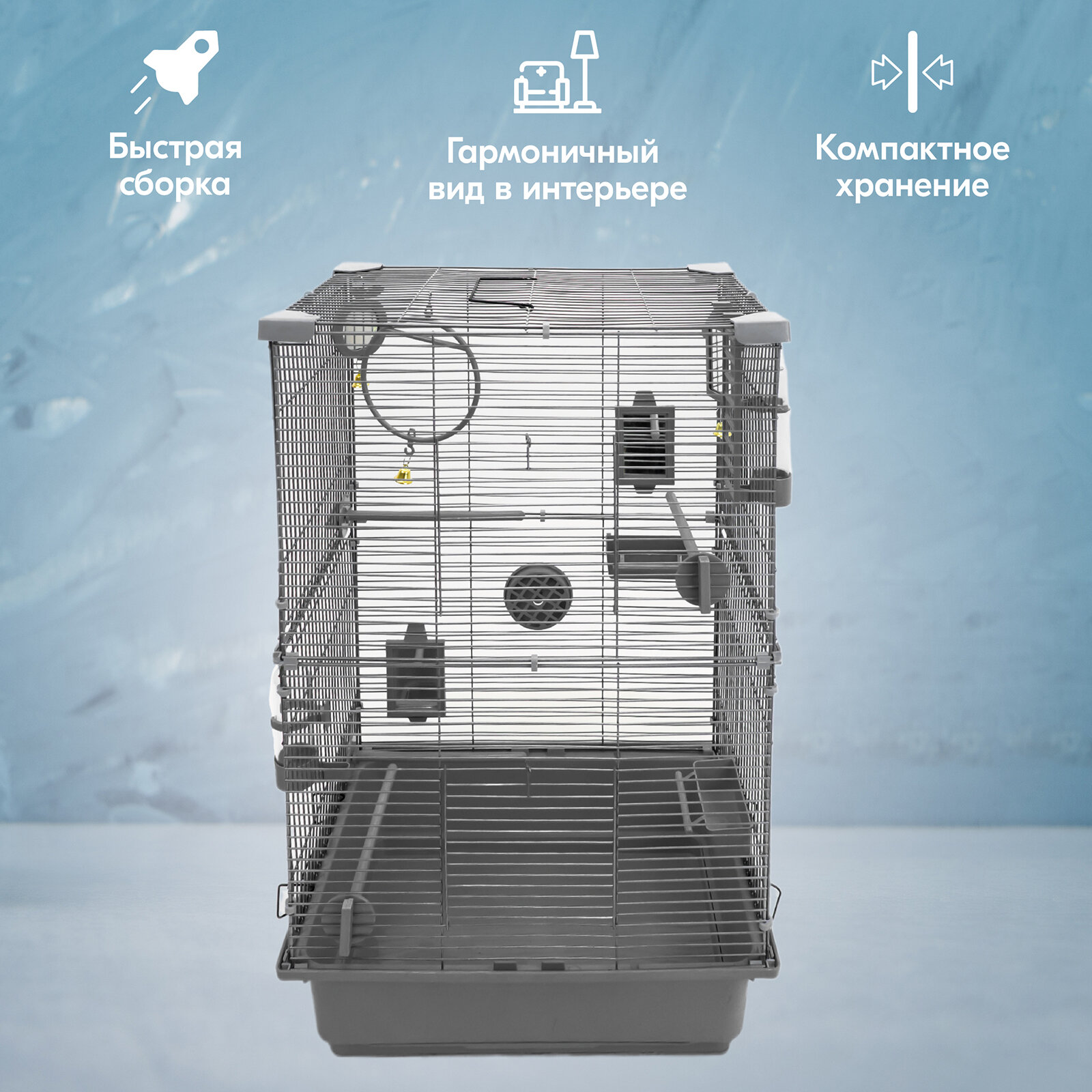 Клетка для птиц разборная "PetTails", шаг прута до 11мм, 42*30*h62,7см, светло-серая