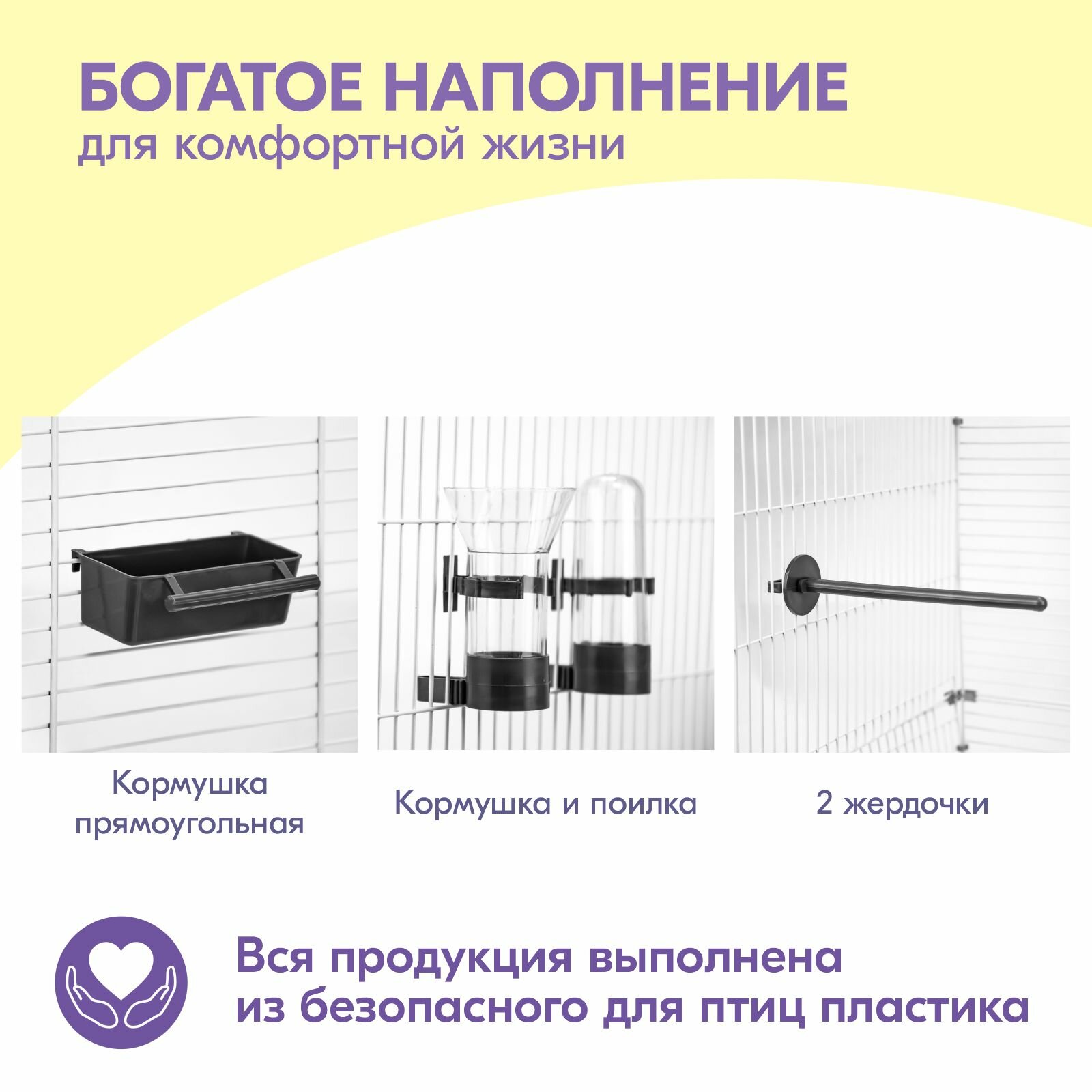 | В комплекте | жёрдочка / зеркальце / качели / кормушка / поилка |
