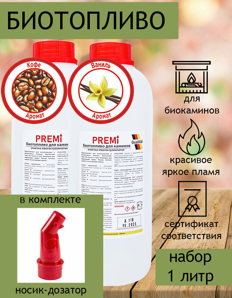 Биотопливо для биокамина Premi Aroma набор 1 литр кофе, ваниль с носиком (2 бутылки по 500 мл) интересное: