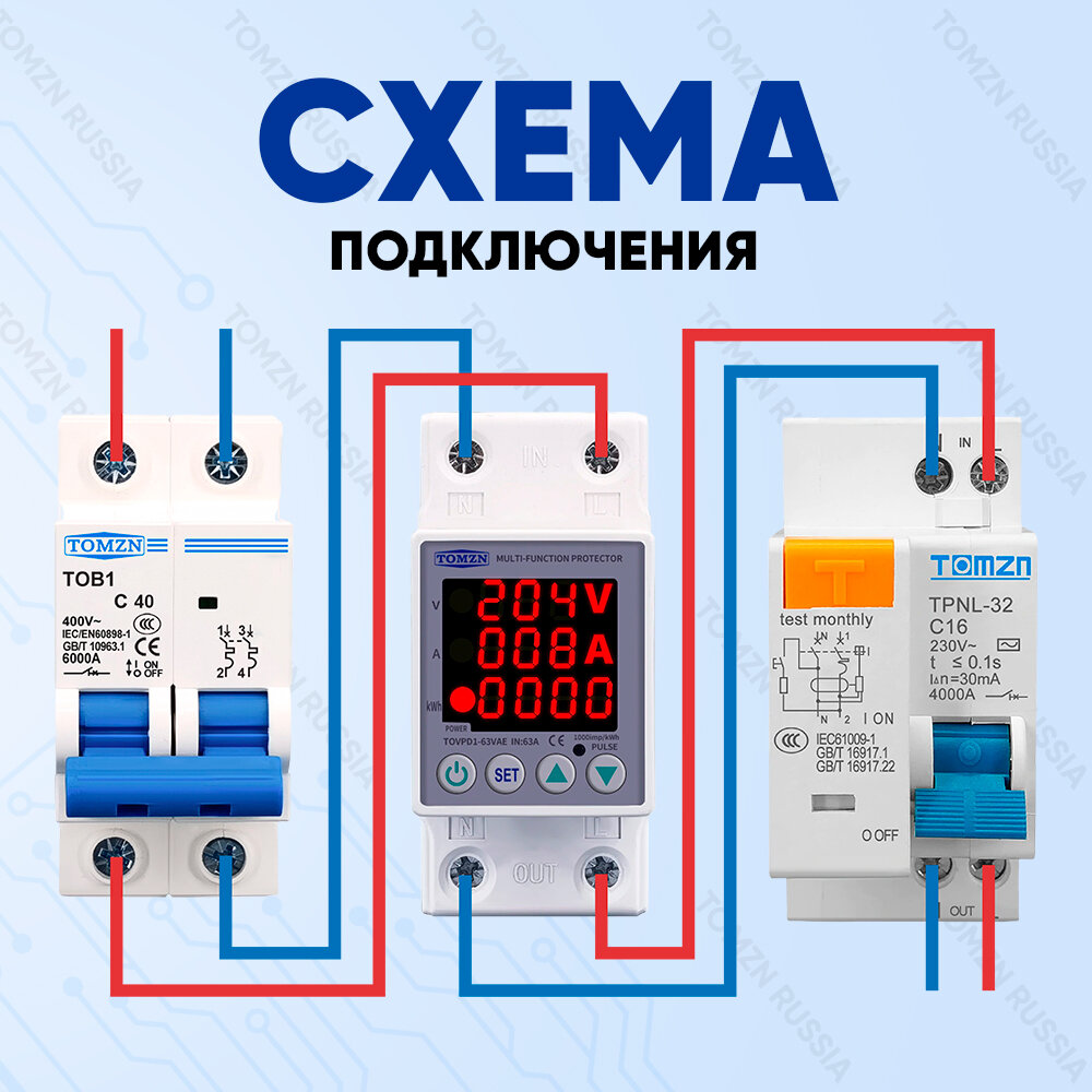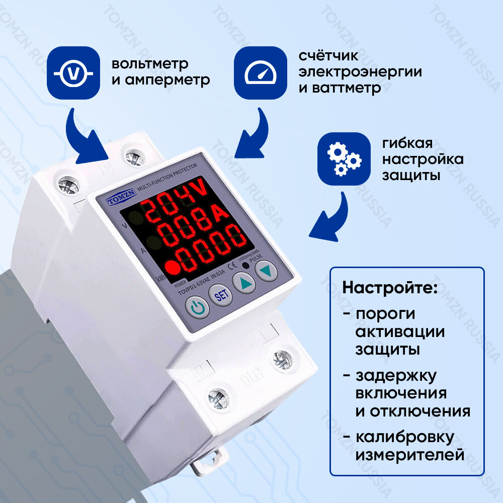 Реле контроля напряжения TOMZN TOVPD1-63VAE с защитой от перегрузки по току и перенапряжения 63 А / Защитное устройство в DIN рейку интересное: