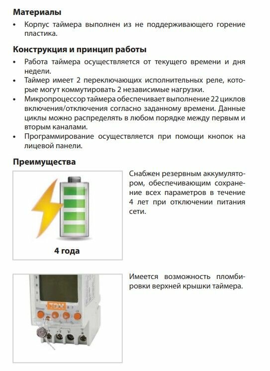| Дополнительная информация | корпус прибора из не поддерживающего горение пластика; микропроцессор таймера обеспечивает выполнение 22 циклов включения/выключения согласно заданному времени; имеется возможность пломбировки верхней крышки таймера; для предотвращения доступа к программированию возможна установка пароля; диапазон рабочих напряжений: 180-250 В; ширина DIN рейки: 36 см (2 модуля DIN); потребляемая мощность, не более: 7.5 Вт |