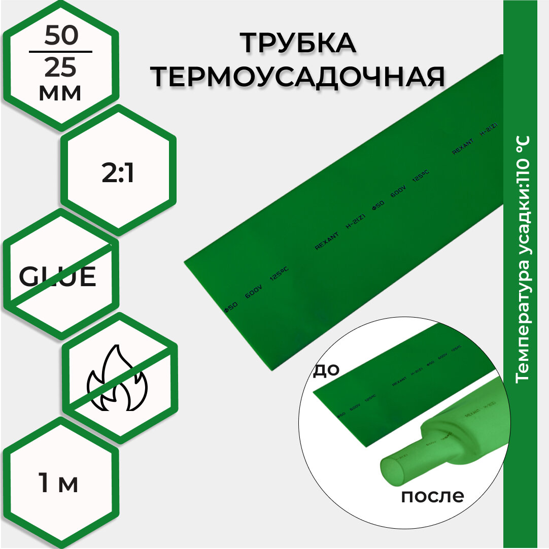 Термоусадка 50,0 / 25,0 мм, зеленая 1 м REXANT интересное: