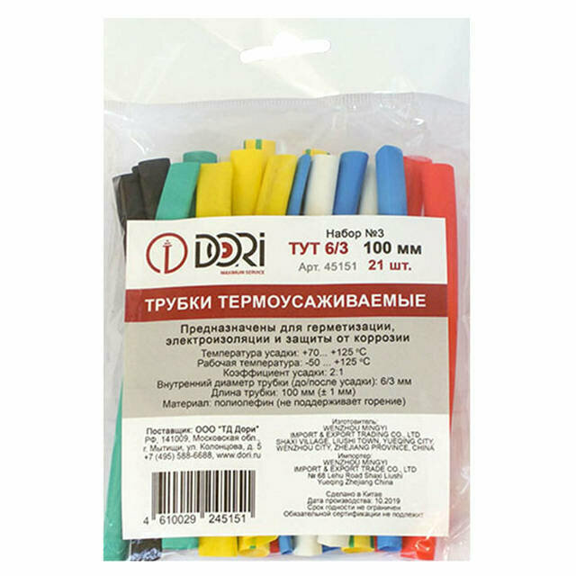 | Дополнительная информация | Набор термоусадочных трубок DORI Тут d 6/3 10см 21шт. разноцвет |
