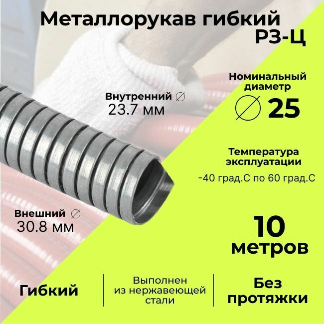 Купить Металлорукав для кабеля оцинкованный Р3 - Ц - 25 D25мм серый - 10м