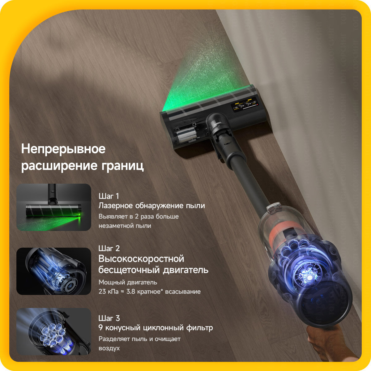 | В комплекте | зарядное устройство, лазерная насадка с мягким валиком, насадка для ламината и паркета, щелевая насадка |