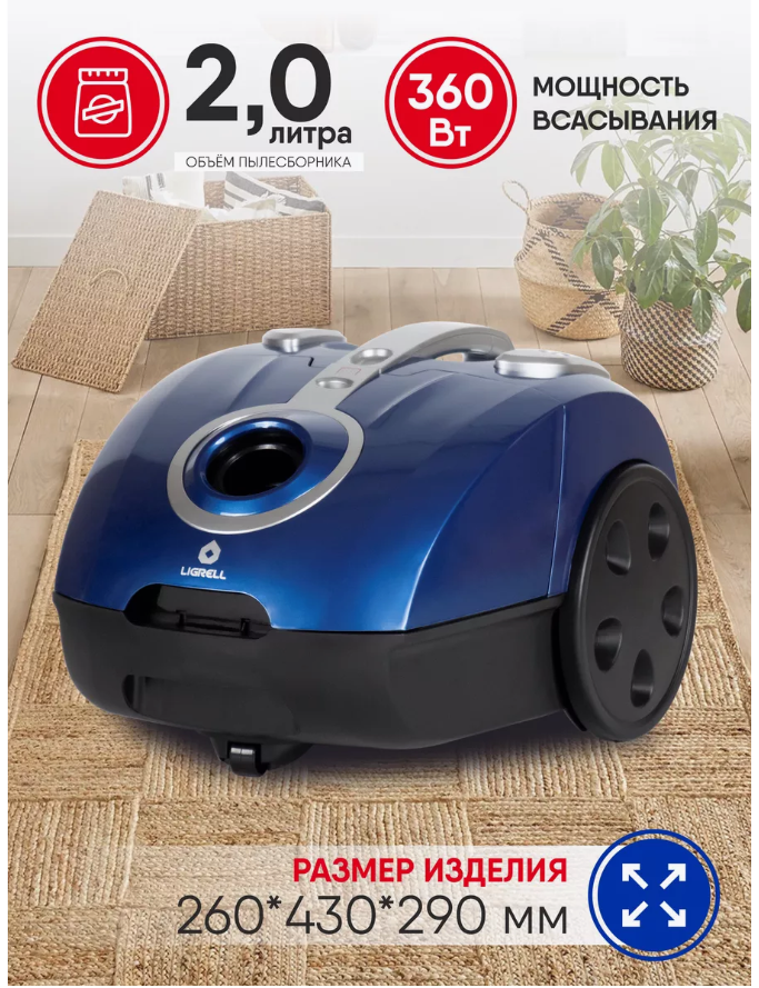 Пылесос Ligrell LE-VC180B, мощность 1800 Вт, объем пылесборника 2 л, пятиступенчатая система фильтрации, cиний