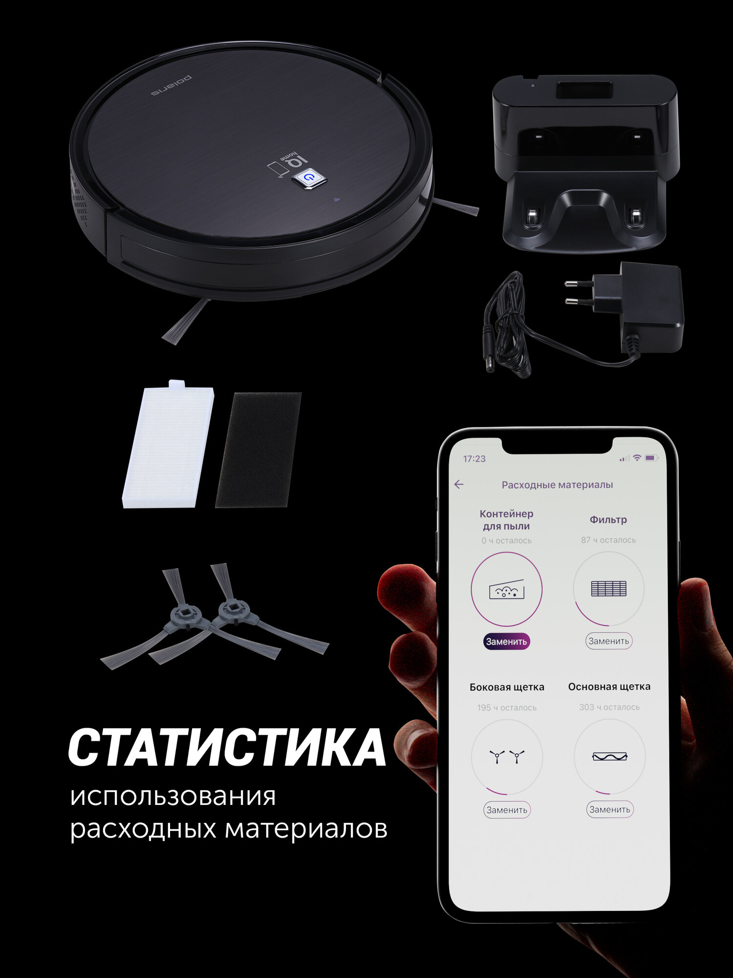 | Режимы | быстрая уборка, движение вдоль стен, движение по спирали, местная уборка, уборка по заданному маршруту |