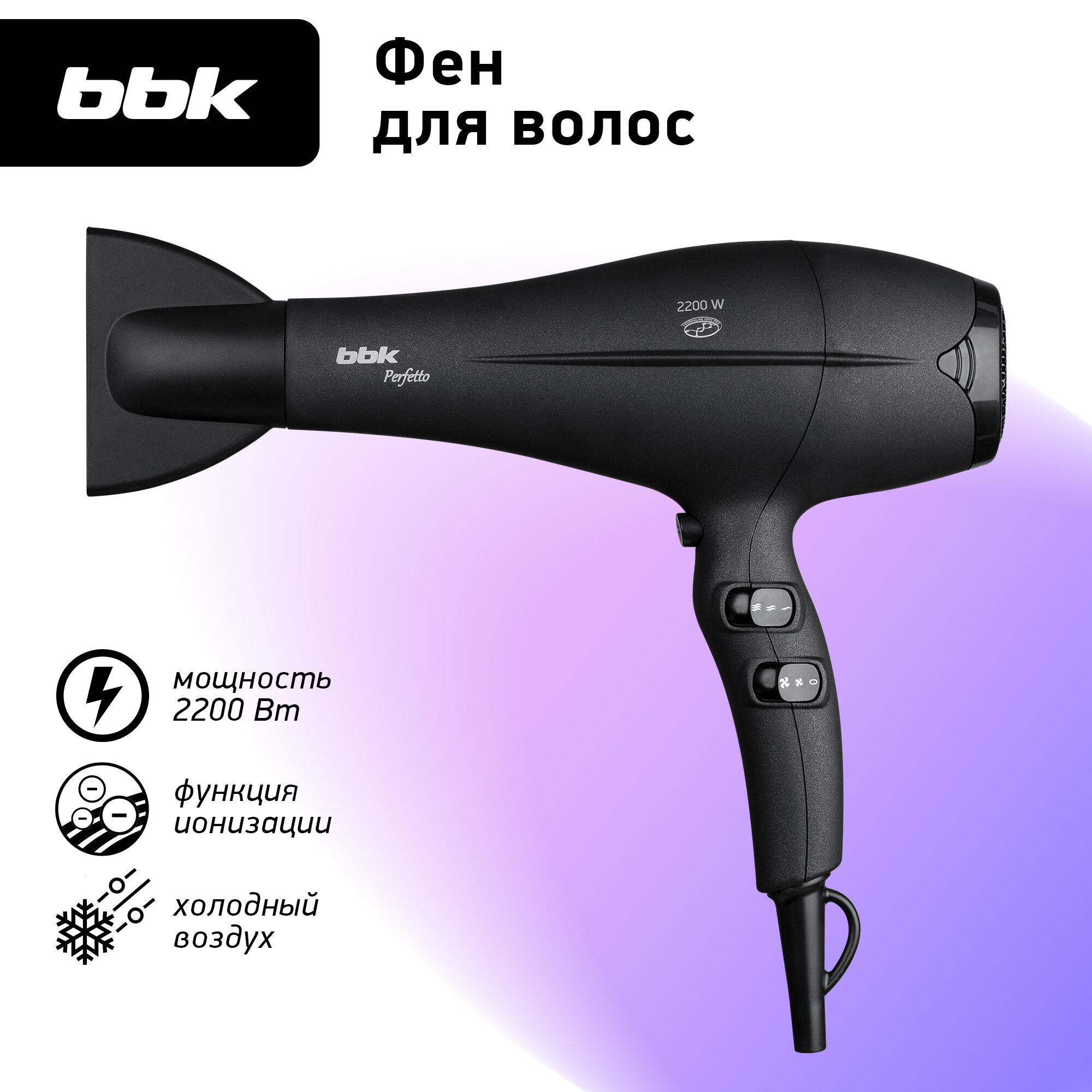 Фен для волос BBK BHD3227i черный, мощность 2200 Вт, 2 скорости, 3 уровня температуры