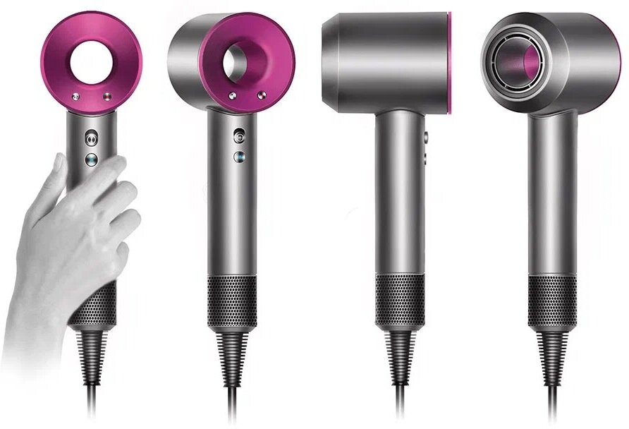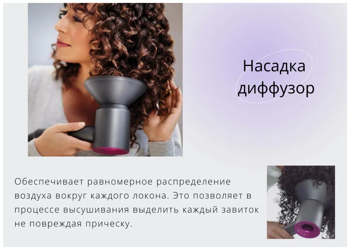 | Плюсы: | Отлично сушит волосы, несмотря на небольшой размер большой поток воздуха. Очень удобные насадки. Длинный шнур. |