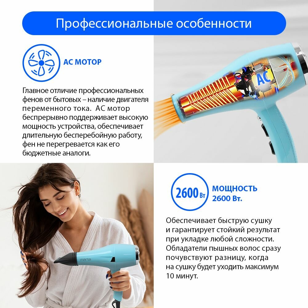 Фен для волос профессиональный MARTA MT-1260, AC мотор, 2600Вт, длина шнура электропитания 2,6 м, голубой аквамарин