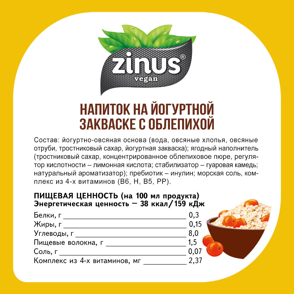 Zinus " Овсянка,сэр!". Йогуртно-овсяный напиток без молока с облепихой, 250г/ПЭТ/спайка 6 штук интересное: